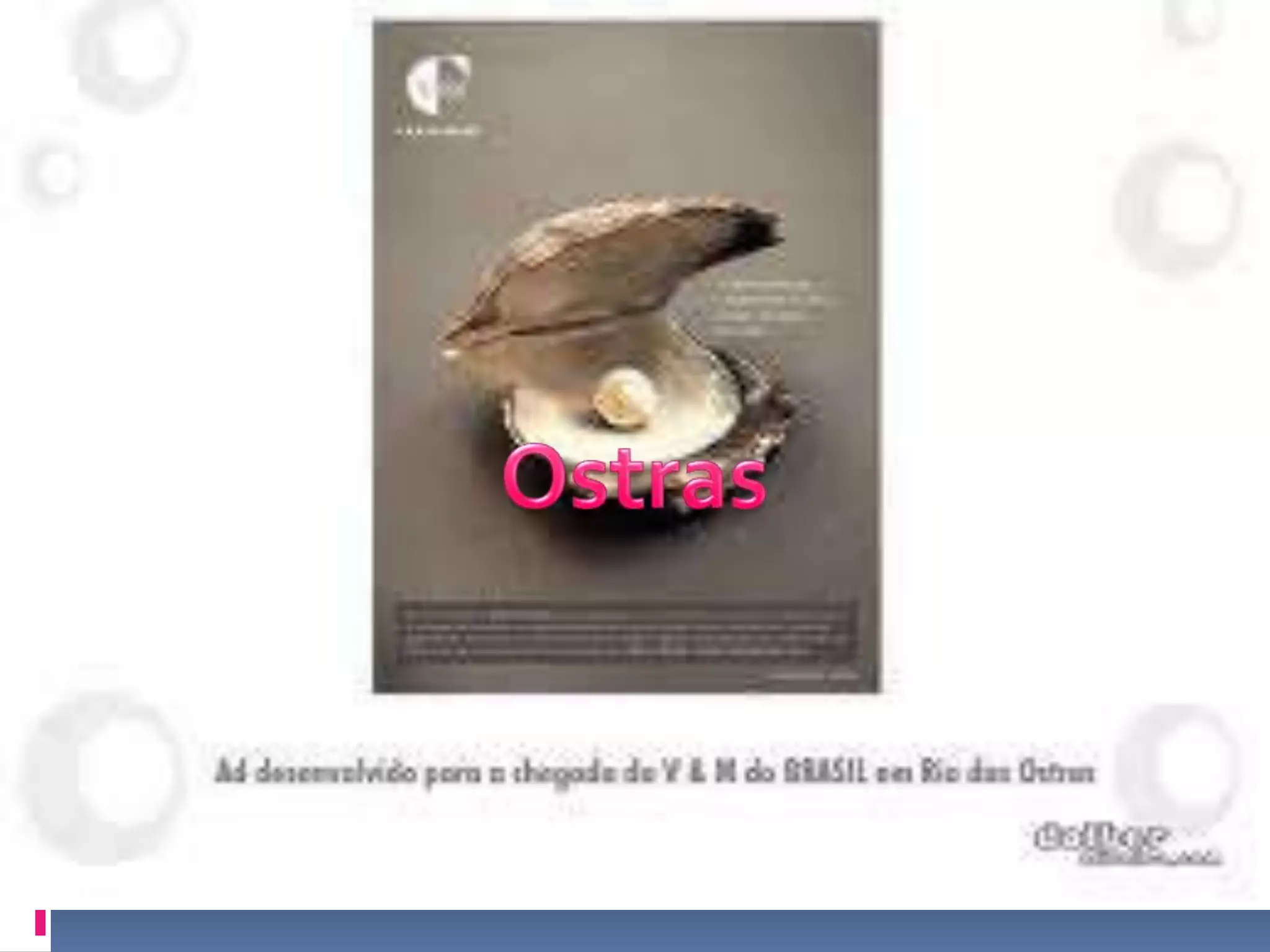 O documento descreve as características das ostras, incluindo que elas filtram plâncton para se alimentar, produzem pérolas como defesa contra parasitas, e são usadas como alimento e para produção de jóias.