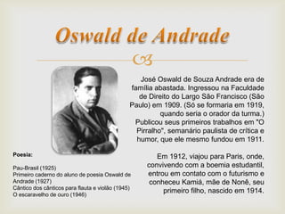 José Oswald de Souza Andrade era um escritor brasileiro modernista que publicou obras importantes como "Pau-Brasil" e "Primeiro Caderno do Aluno de Poesia". Ele foi fundamental para a cultura brasileira no século 20, promovendo o movimento Pau-Brasil e escrevendo o "Manifesto Antropofágico". Sua vida foi marcada por muitas viagens, casamentos e ativismo político de esquerda.