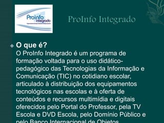 O documento discute vários cursos de formação para professores sobre o uso de tecnologias digitais na educação, incluindo o ProInfo Integrado, cursos sobre internet segura, e o programa FormAção pela Escola do Fundo Nacional de Desenvolvimento da Educação.