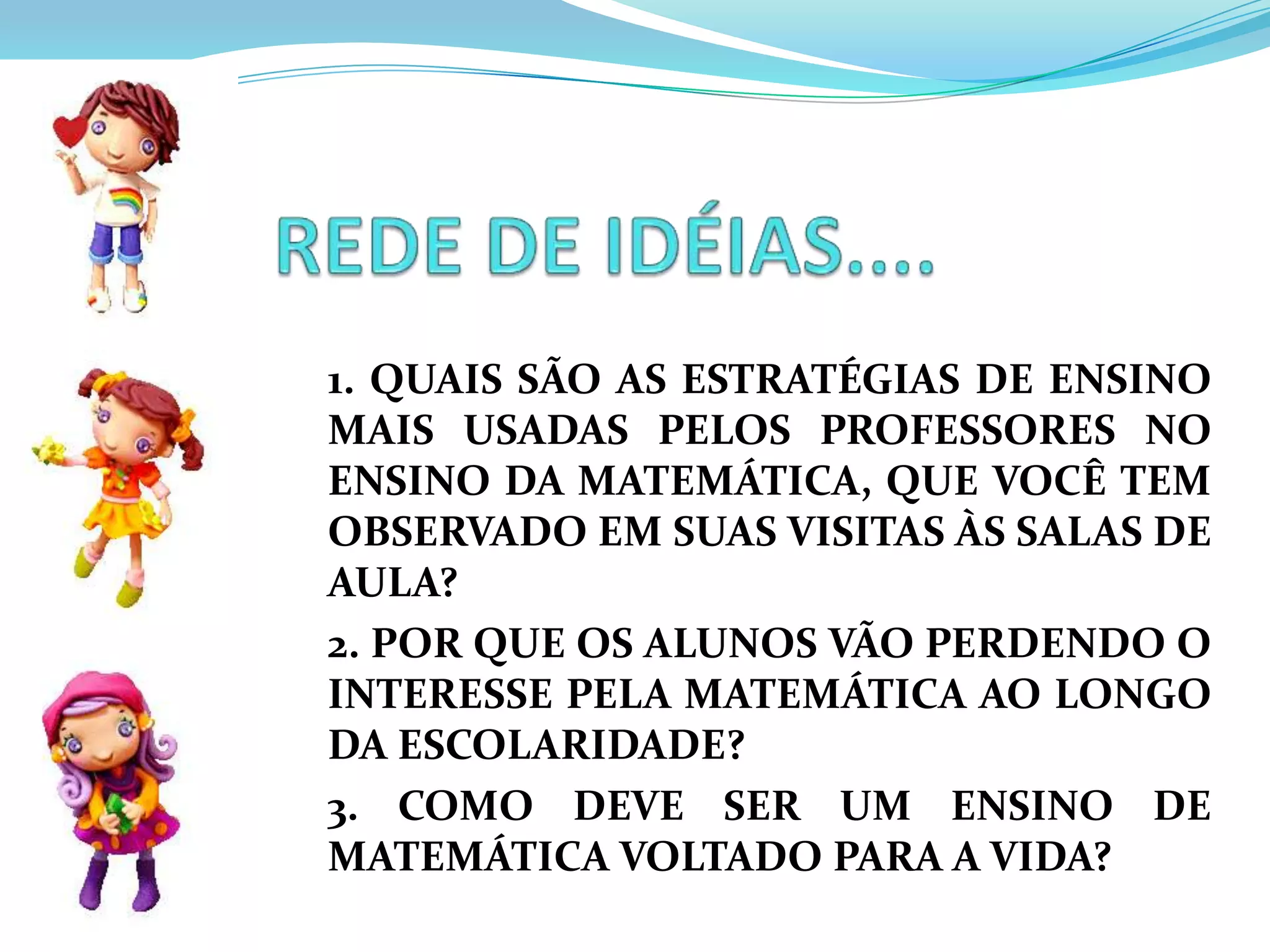 REDE DE IDÉIAS....1.QUAIS SÃO AS ESTRATÉGIAS DE ENSINO MAIS USADAS PELOS PROFESSORES NO ENSINO DA MATEMÁTICA, QUE VOCÊ TEM OBSERVADO EM SUAS VISITAS ÀS SALAS DE AULA?2. POR QUE OS ALUNOS VÃO PERDENDO O INTERESSE PELA MATEMÁTICA AO LONGO DA ESCOLARIDADE?3. COMO DEVE SER UM ENSINO DE MATEMÁTICA VOLTADO PARA A VIDA?