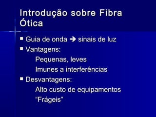 O documento fornece uma introdução sobre fibra ótica e o equipamento OTDR, que é usado para testar e localizar defeitos em fibras óticas. Ele descreve os tipos de fibra ótica, como o OTDR funciona ao emitir pulsos de luz e analisar a luz refletida, e possíveis erros como ecos, saturação e variações na composição da fibra que podem afetar os resultados. É essencial entender o funcionamento do OTDR e como interpretar corretamente seus resultados durante testes em fibras óticas.
