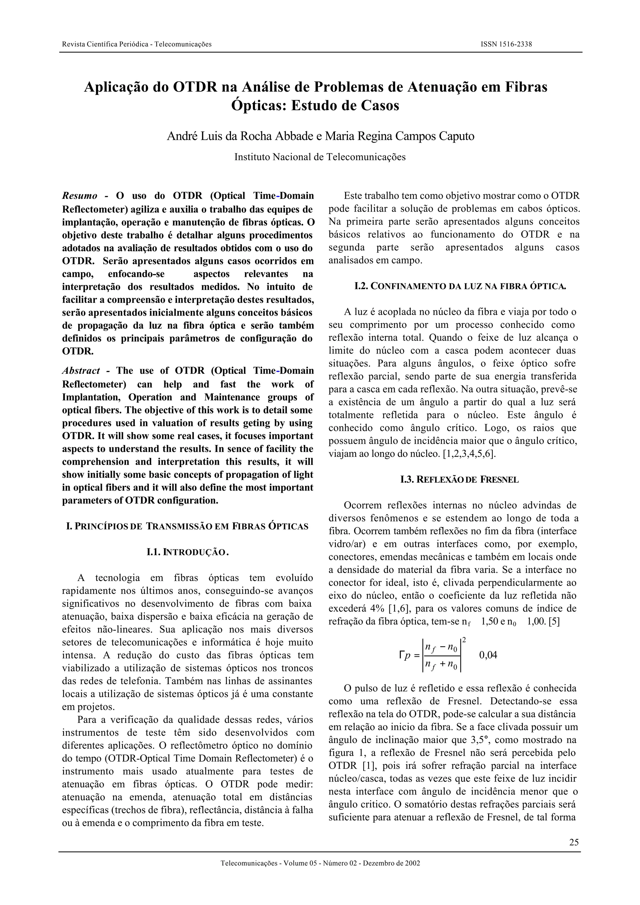 O documento descreve o uso do OTDR (Optical Time-Domain Reflectometer) para analisar problemas de atenuação em fibras ópticas, apresentando casos reais. O OTDR mede parâmetros como atenuação, distância a falhas e comprimento da fibra. Inicialmente, conceitos como propagação da luz em fibras e reflexão de Fresnel são explicados. Em seguida, detalha o funcionamento do OTDR e como interpretar seus resultados, identificando eventos como conectores e falhas.