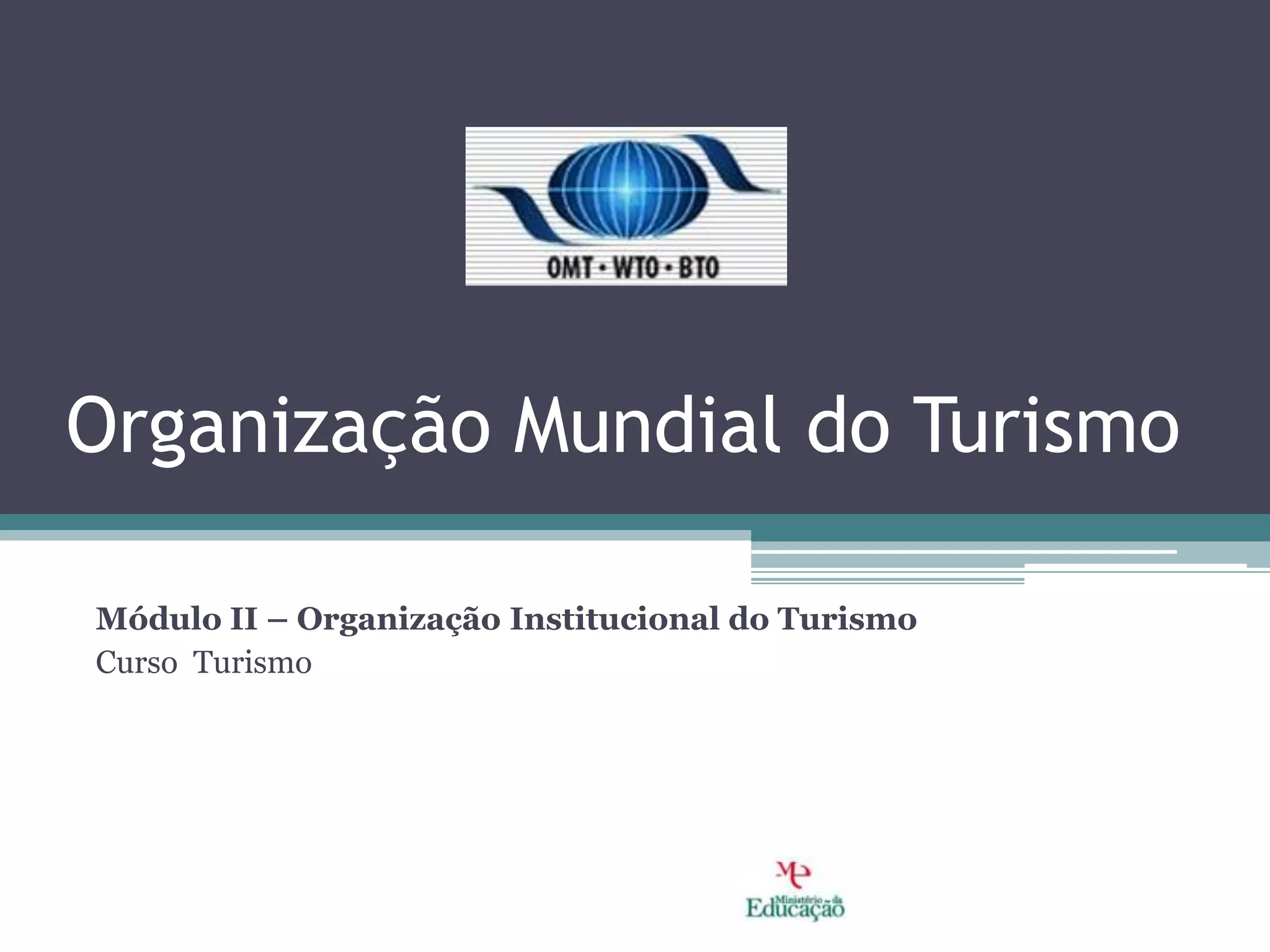 O documento descreve a Organização Mundial do Turismo (OMT), criada em 1975 como agência especializada das Nações Unidas para promover o desenvolvimento responsável do turismo. Apresenta também as principais organizações nacionais e internacionais ligadas ao turismo em Portugal.