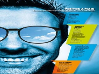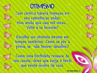 O documento discute o marketing pessoal e a importância do otimismo. Ele explica que o marketing pessoal é sobre vender a si mesmo e posicionar suas habilidades no mercado de trabalho. Além disso, destaca que o otimismo protege contra doenças, aumenta a autoestima e melhora as relações, e fornece dez razões para ser mais otimista, como criar um mundo melhor ao seu redor e se tornar mais produtivo.