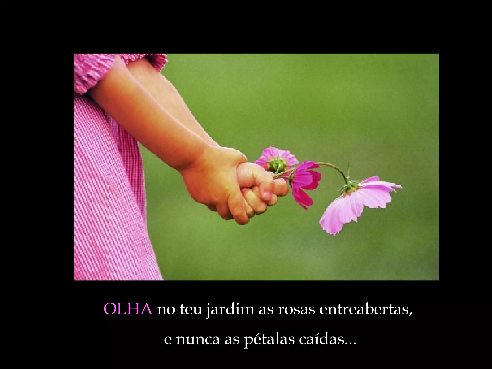 O documento encoraja o leitor a focar nos aspectos positivos da vida, como beleza, realizações, amor e bondade, e esquecer os negativos, como tristeza, fracassos e maldade. Aconselha a apreciar as flores que desabrocham, os olhares de amor recebidos e a bondade interior, em vez de se lamentar pelas pétalas caídas, caminhos desviados ou mal feito. Pede também para ser otimista e confiar que a vida continuará abençoada.