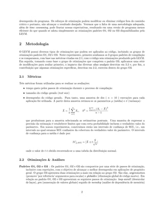 Este documento resume os resultados experimentais de análises e otimizações no LLVM. Foram avaliados os padrões O1, O2 e O3 do LLVM em aplicações do SPEC CPU2006, além de diferentes alias analyses e otimizações individuais. A metodologia empregada mediu o tempo de compilação, tamanho de código e desempenho, buscando identificar a melhor configuração de análises e otimizações para cada tipo de aplicação.