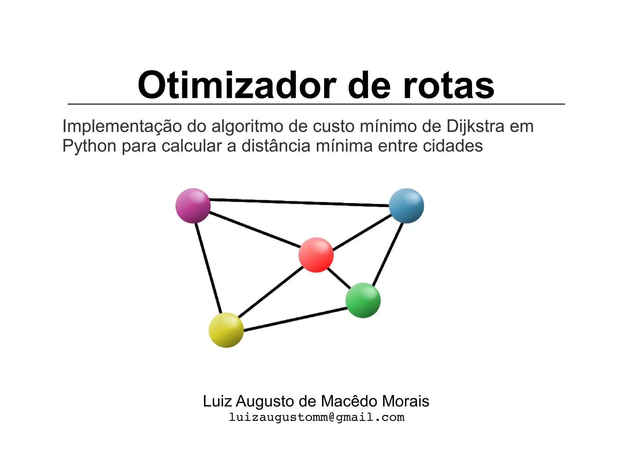 Luiz Augusto de Macêdo Morais apresenta o algoritmo de Dijkstra para cálculo da distância mínima entre cidades, descrevendo sua implementação em Python e o programa Otimizador de Rotas que utiliza este algoritmo para encontrar rotas otimizadas entre localidades.