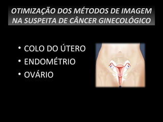 O documento discute os métodos de imagem para avaliar suspeita de câncer ginecológico, incluindo colo do útero, endométrio e ovário. Para o colo do útero, o resumo destaca que a ressonância magnética fornece um estadiamento mais preciso do que métodos clínicos e tomografia computadorizada. Para o endométrio, enfatiza que a ressonância magnética é a técnica mais precisa para avaliar a invasão miometrial. E para ovário, ressalta que o ult