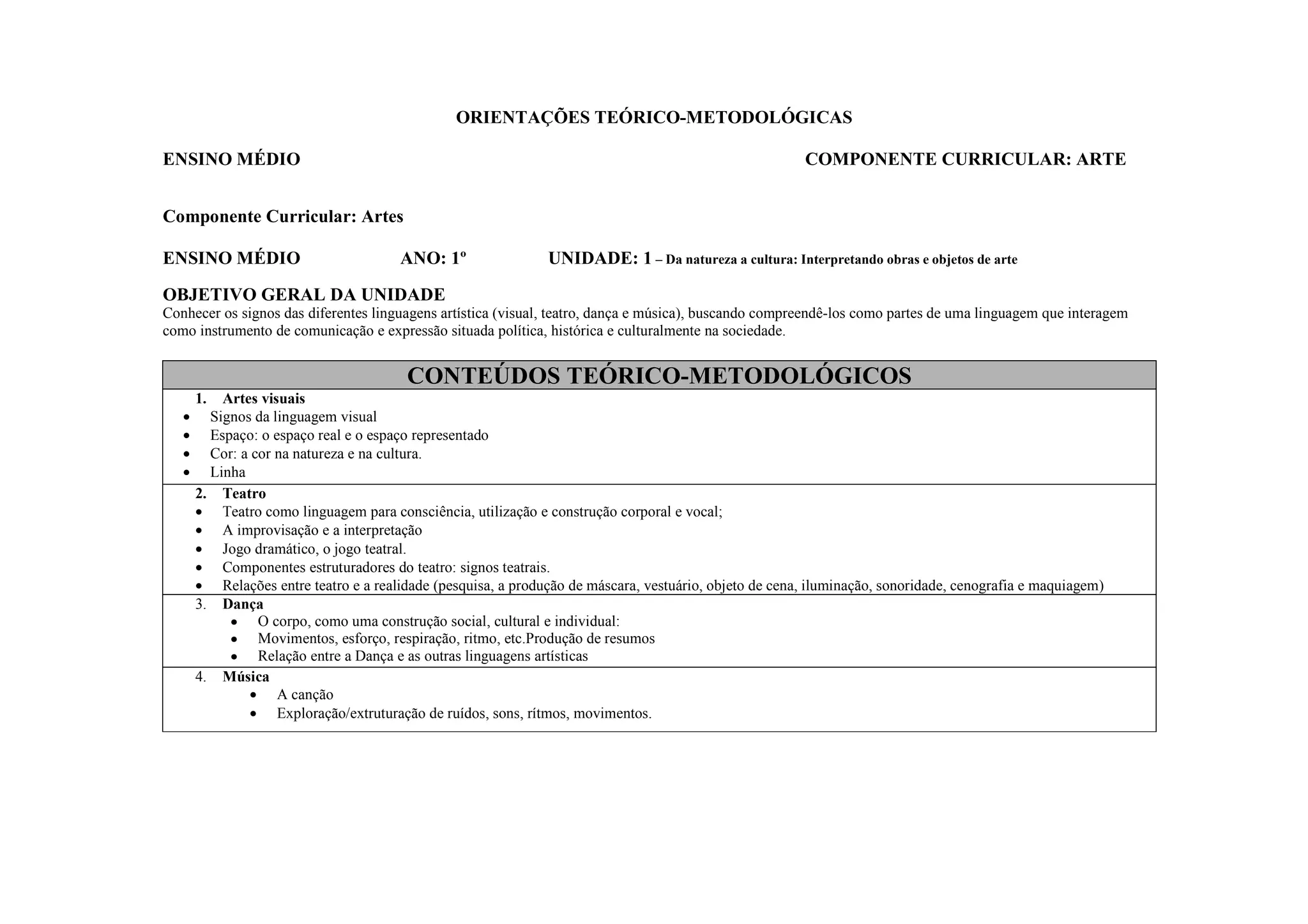 The document outlines an arts curriculum for high school students, divided into 4 units that cover different artistic languages and skills. The units focus on interpreting works of art, understanding production and context, making interdisciplinary connections, and developing student autonomy. The curriculum aims to understand signs and communication across visual arts, theatre, dance, and music.