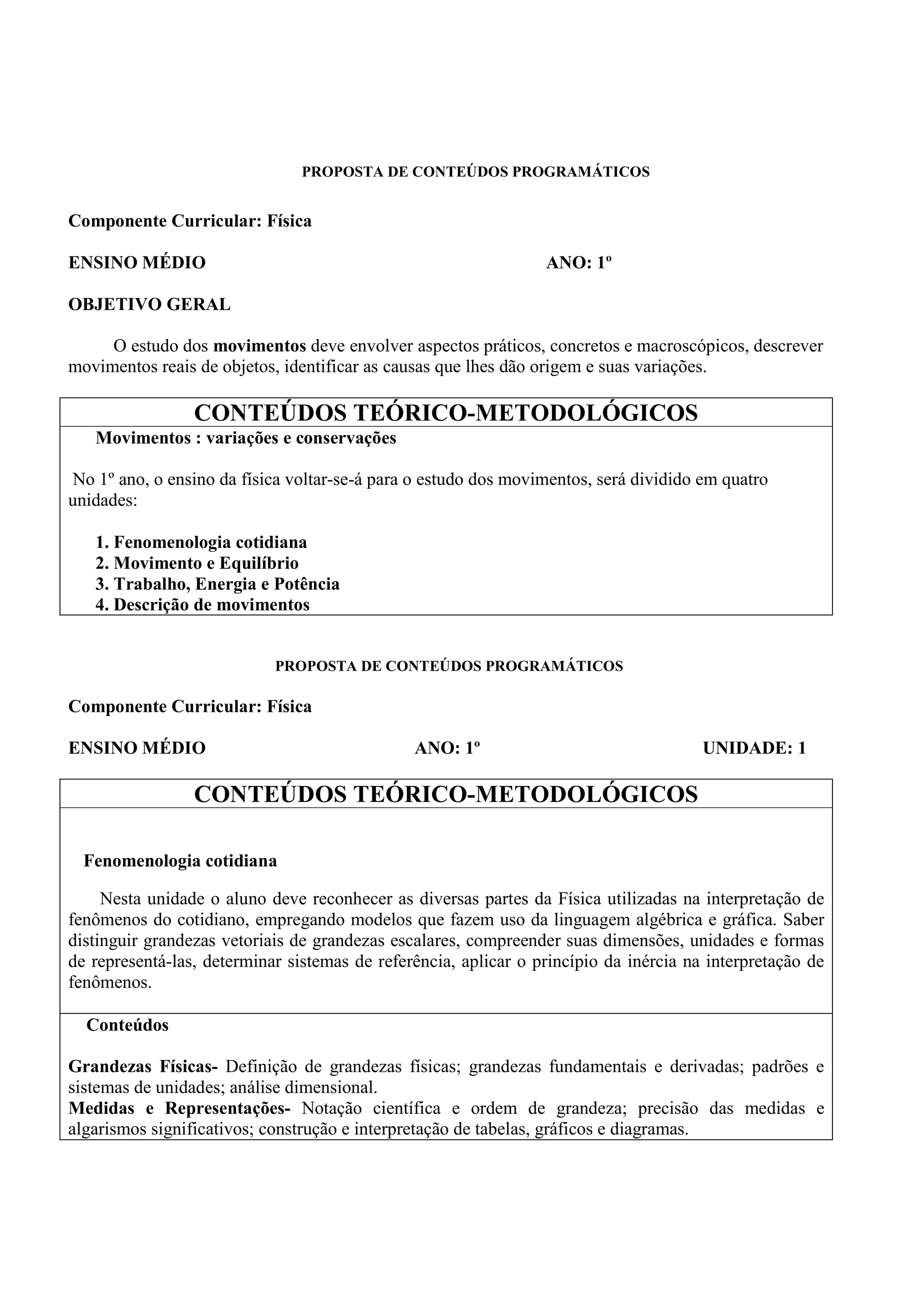 O documento apresenta propostas de conteúdos programáticos para o ensino de Física no 1o ano do Ensino Médio. Os conteúdos serão divididos em 4 unidades e abordarão os tópicos de movimentos, forças e equilíbrio. A primeira unidade tratará de fenômenos cotidianos, grandezas físicas e vetores. A segunda abordará descrição de movimentos, dinâmica e estática. A terceira tratará de trabalho, energia e conservação. E a quarta unidade descreverá