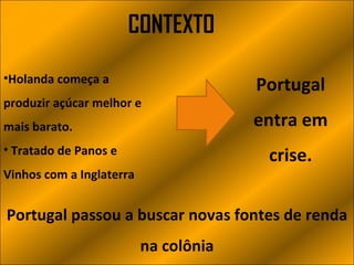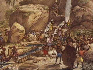O documento descreve a descoberta de ouro em Minas Gerais no século XVII e suas consequências para a economia e sociedade brasileira. As primeiras descobertas foram feitas por bandeirantes paulistas por volta de 1693, dando início à corrida do ouro e disputas pelo controle dos veios auríferos. Isso levou ao crescimento populacional e econômico da região, e transferência do eixo econômico para o Centro-Sul do Brasil.