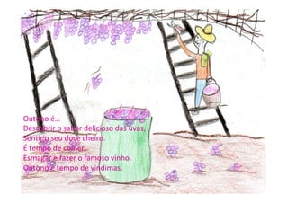 O documento descreve as várias características da estação outono através de vinte e duas breves estrofes poéticas, incluindo a colheita de uvas e fabricação de vinho, a colheita de milho e fabricação de pão, a queda das folhas das árvores, as belas cores das folhas que caem, os diferentes sabores de frutos colhidos nesta estação como marmelos e maçãs, a preparação de marmelada, as atividades de animais para se preparar para o inverno como esquilos e ursos
