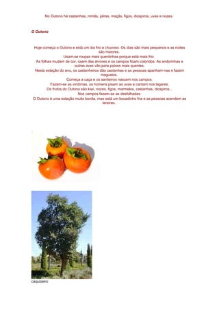 O documento descreve as características da estação do outono, incluindo as frutas típicas como castanhas, romãs, pêras, maçãs, figos e nozes. Também menciona que as folhas das árvores mudam de cor e caem, e as aves migram para locais mais quentes.