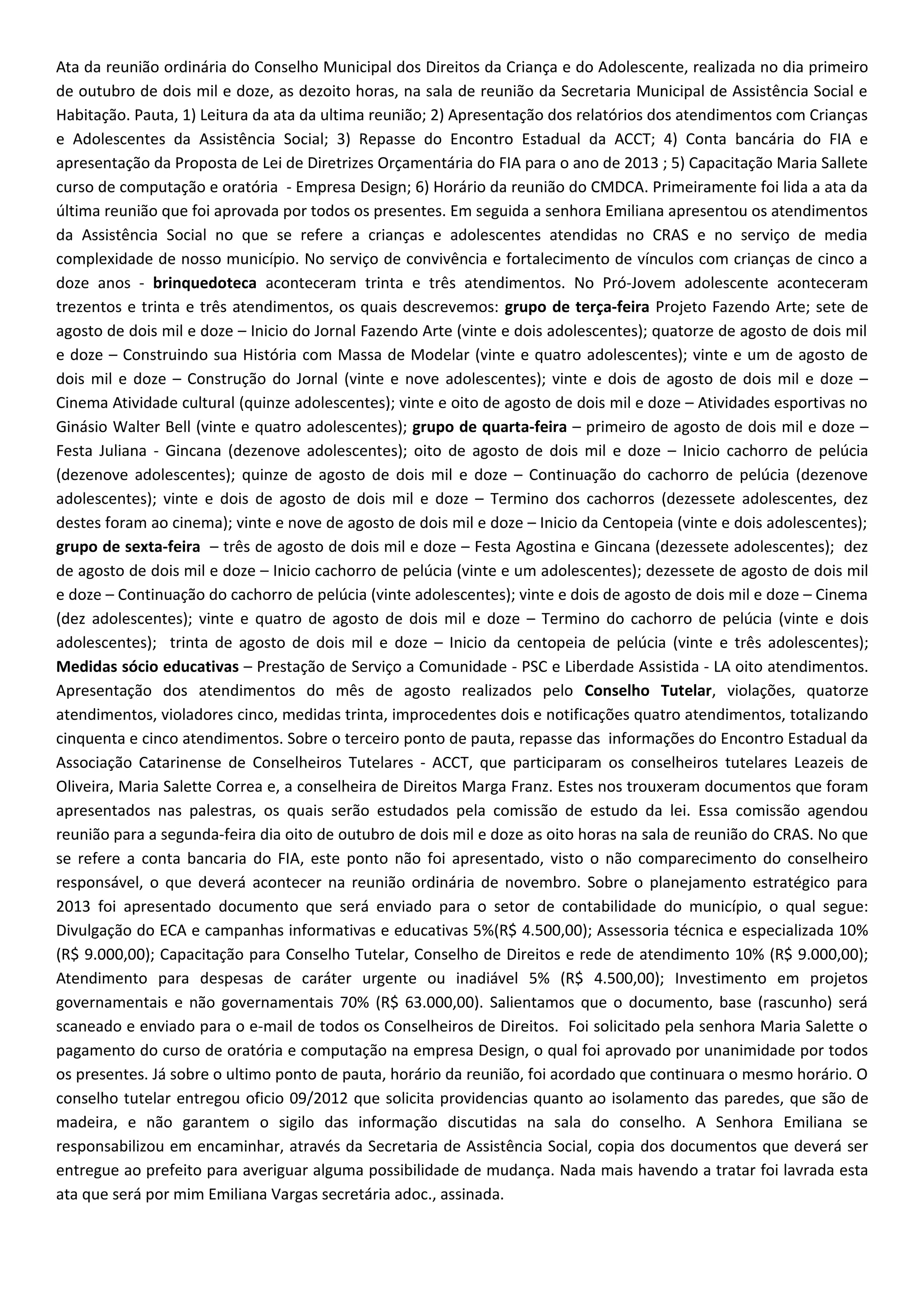 1) A ata resume uma reunião do Conselho Municipal dos Direitos da Criança e do Adolescente sobre relatórios de atendimentos, repasse de informações de um encontro estadual, e proposta orçamentária para 2013.