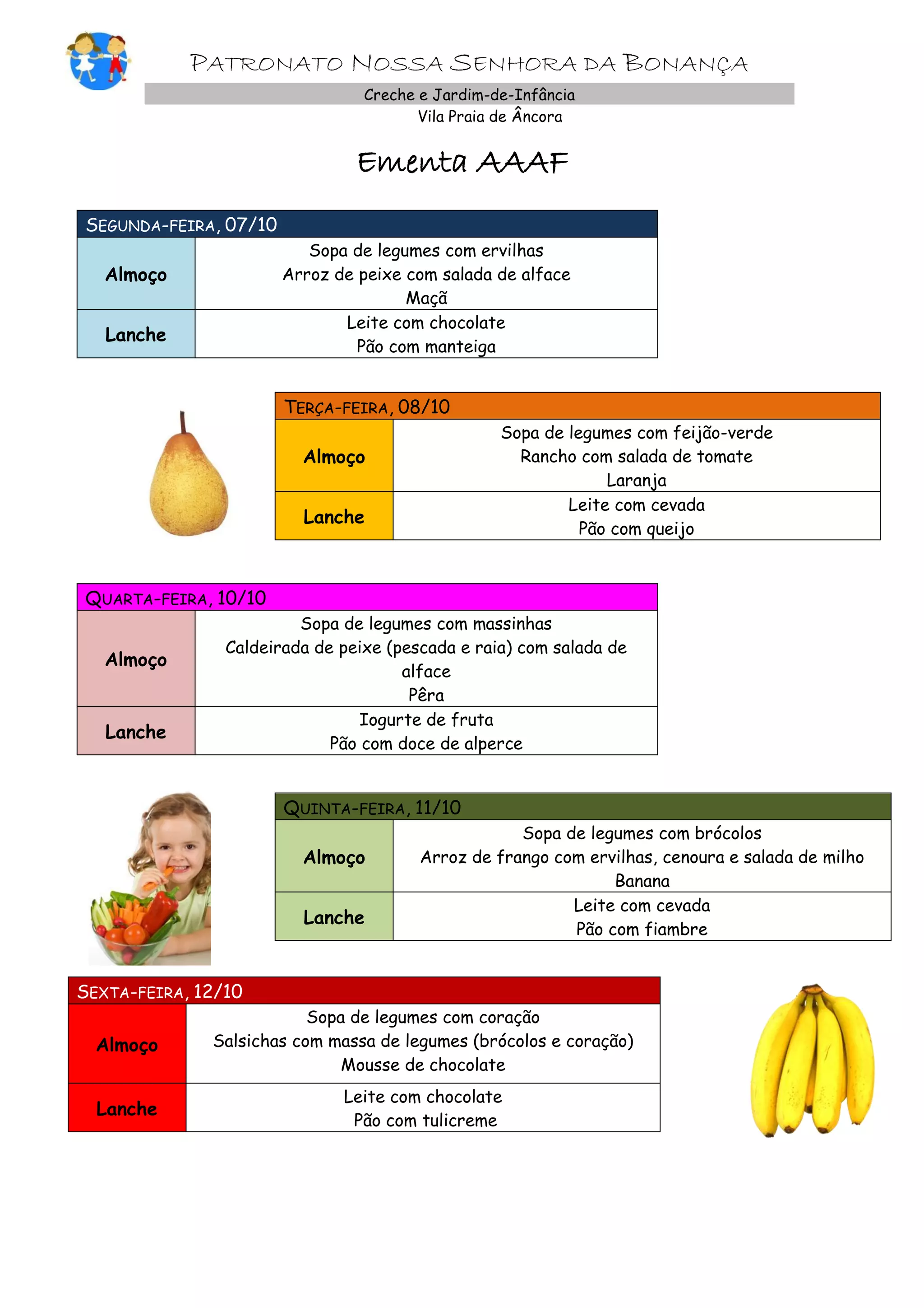 Este documento contém as ementas semanais de uma creche e jardim-de-infância em Vila Praia de Âncora, incluindo as sopas, pratos principais, sobremesas e lanches servidos de segunda a sexta-feira. As refeições incluem peixe, carne, ovos, massas, arroz e legumes variados, acompanhados de saladas e fruta.