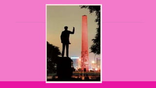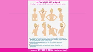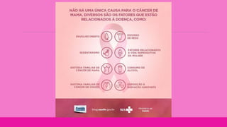 O documento descreve a história do Outubro Rosa, começando nos Estados Unidos e se espalhando para o mundo. No Brasil, a primeira iniciativa foi iluminar o Obelisco do Ibirapuera em rosa em 2002, e desde então diversos monumentos e prédios passaram a ser iluminados em outubro. O texto também discute a importância da luta contra o câncer de mama e formas de prevenção e detecção precoce da doença.
