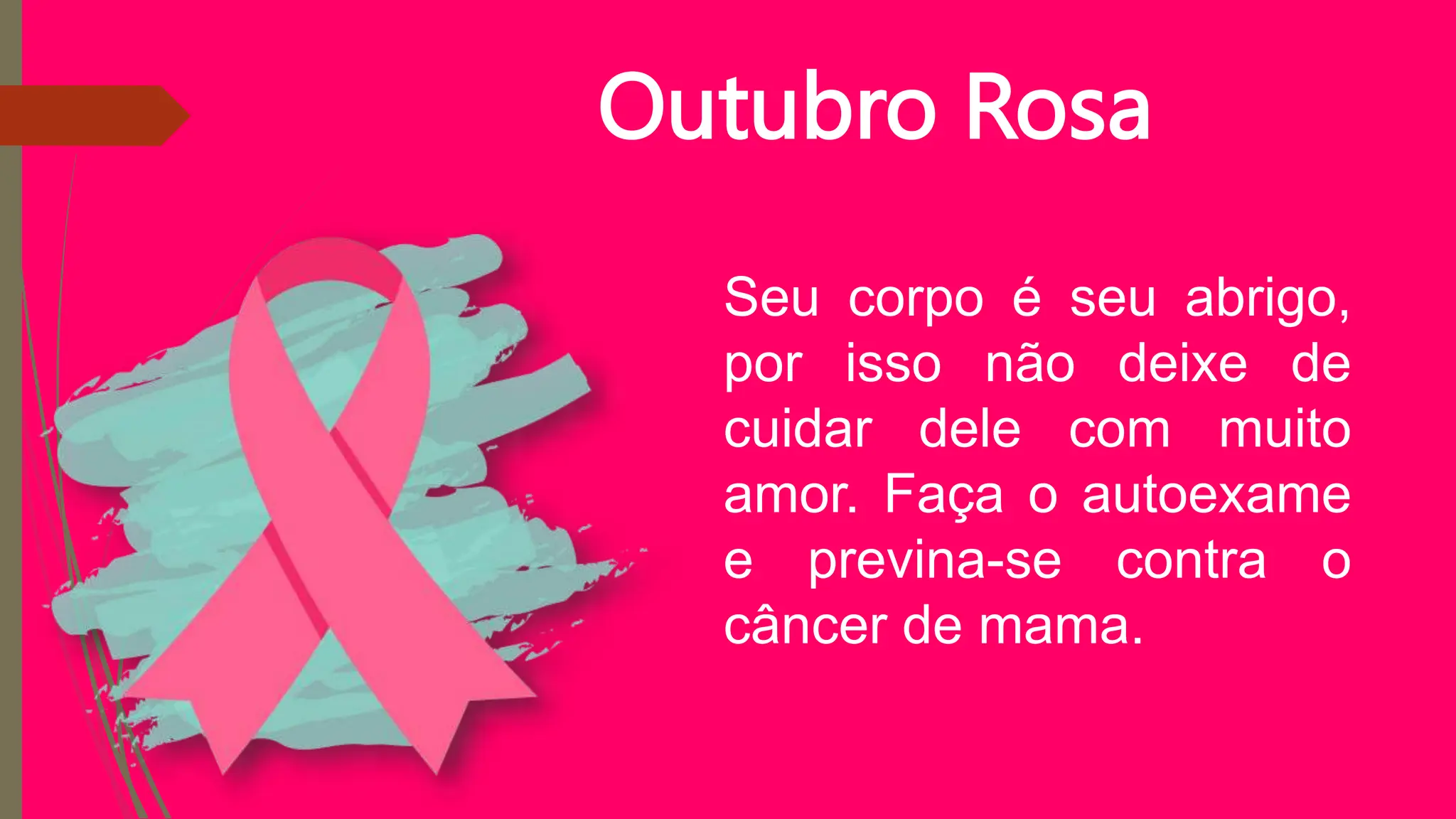 O documento discute o Outubro Rosa, que visa conscientizar sobre prevenção e diagnóstico precoce do câncer de mama. O câncer de mama é o tipo mais comum entre mulheres e uma das principais causas de morte. Realizar autoexame e procurar ajuda médica em caso de alterações pode ajudar na detecção precoce e aumentar as chances de cura.