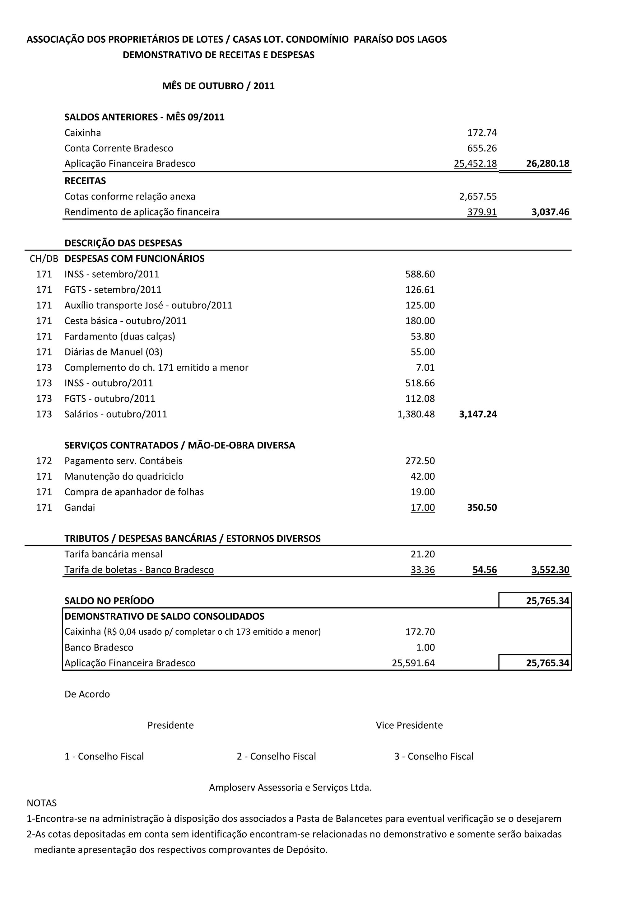 O documento apresenta o demonstrativo de receitas e despesas do Condomínio Paraíso dos Lagos referente ao mês de outubro de 2011. As receitas totalizaram R$3.037,46, provenientes de cotas dos condôminos e rendimentos financeiros. As despesas somaram R$3.552,30, incluindo salários, INSS, serviços terceirizados e tributos. O saldo final no período foi de R$25.765,34.