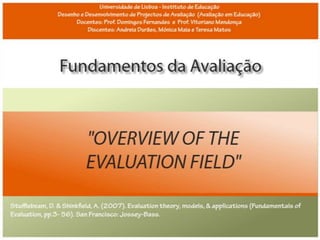Este documento discute a história e os princípios da avaliação educacional. Apresenta as cinco fases históricas da avaliação e explica porque a avaliação é importante para melhorar a sociedade. Também define avaliação segundo o Joint Committee on Standards for Educational Evaluation e discute como a avaliação deve ser implementada e reportada.