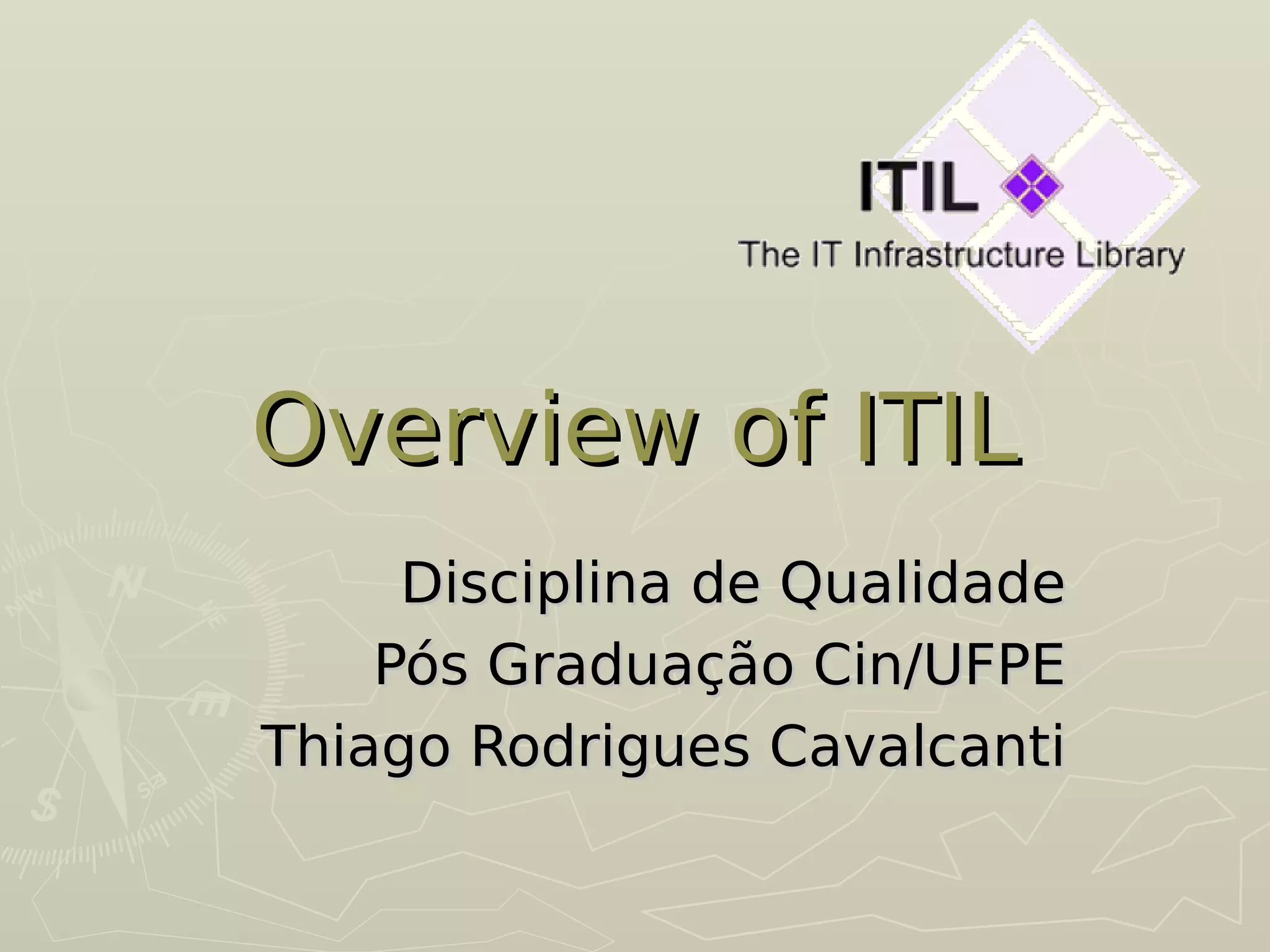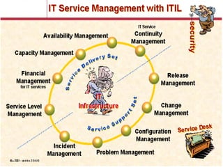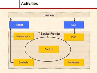O documento apresenta uma introdução sobre o framework ITIL (Information Technology Infrastructure Library) para gerenciamento de serviços de TI. Discutem-se os objetivos de ITIL de alinhar os serviços de TI às necessidades do negócio e melhorar a qualidade dos serviços entregues. Também são apresentados alguns dos principais processos de ITIL como Configuration Management, Incident Management e Problem Management.