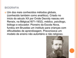 O método Decroly foca no respeito à individualidade da criança e no aprendizado por meio da observação, associação e expressão. As atividades são baseadas nos interesses da criança e realizadas em grupos, frequentemente ao ar livre. O objetivo é que a criança conduza seu próprio aprendizado de forma prazerosa.