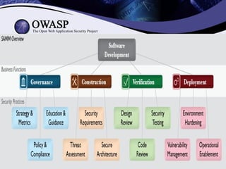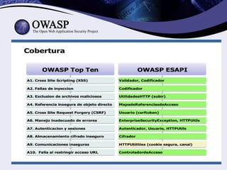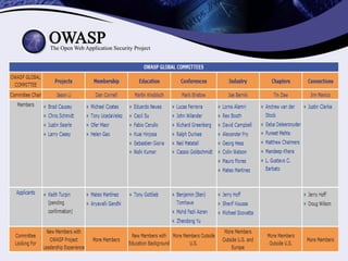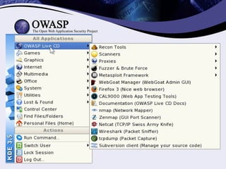 O documento fornece uma introdução sobre o OWASP (Open Web Application Security Project), descrevendo sua estrutura, projetos, ferramentas, conferências e como contribuir. O OWASP é uma organização internacional sem fins lucrativos que promove a segurança de aplicações web por meio de projetos open source e uma comunidade global de voluntários.