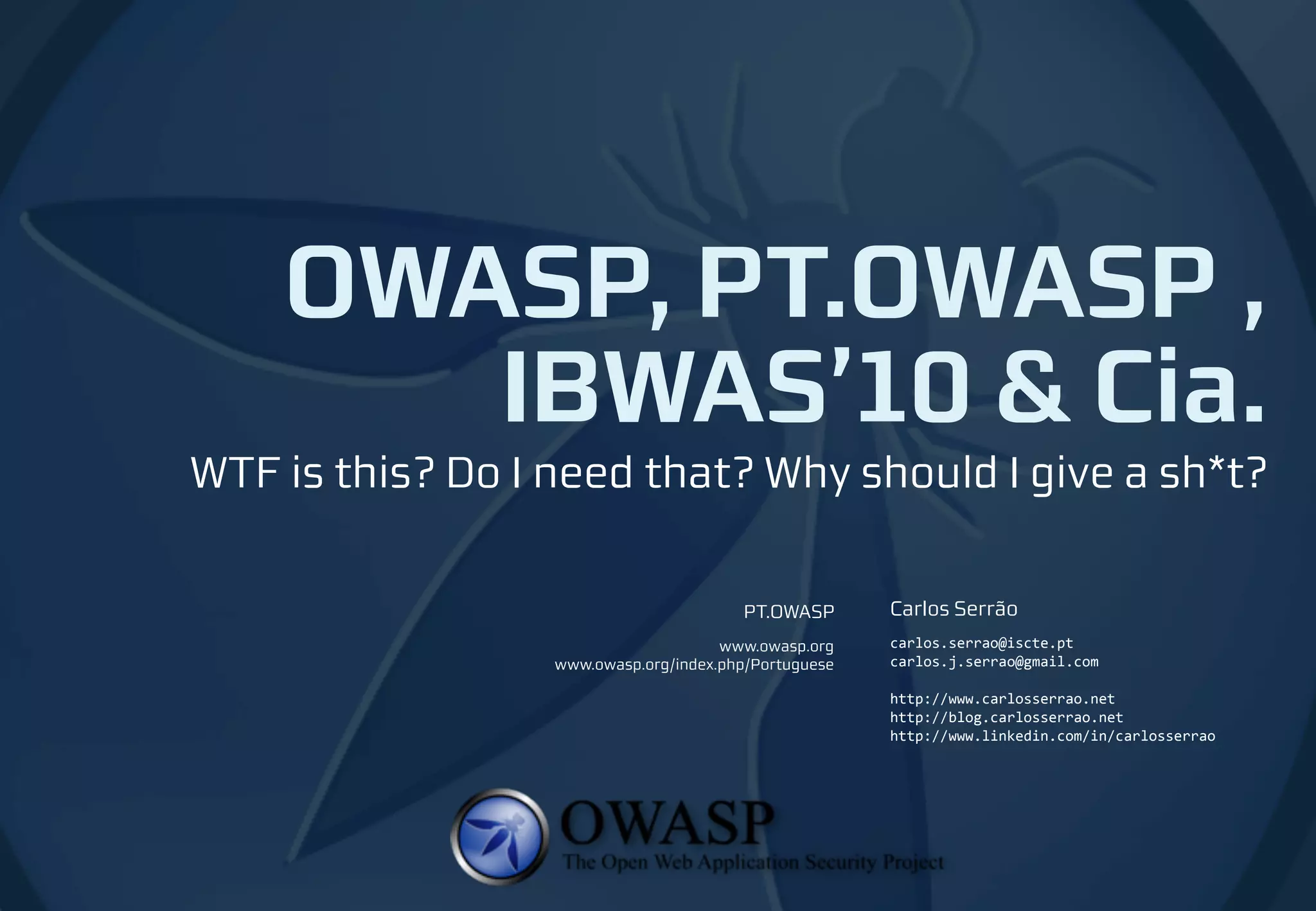 Este documento fornece uma introdução ao Open Web Application Security Project (OWASP). Resume os objetivos e recursos da OWASP, incluindo publicações como o Guia para Desenvolvimento Seguro de Aplicações Web e ferramentas como WebGoat e WebScarab. Também descreve a delegação portuguesa da OWASP e eventos realizados no passado.