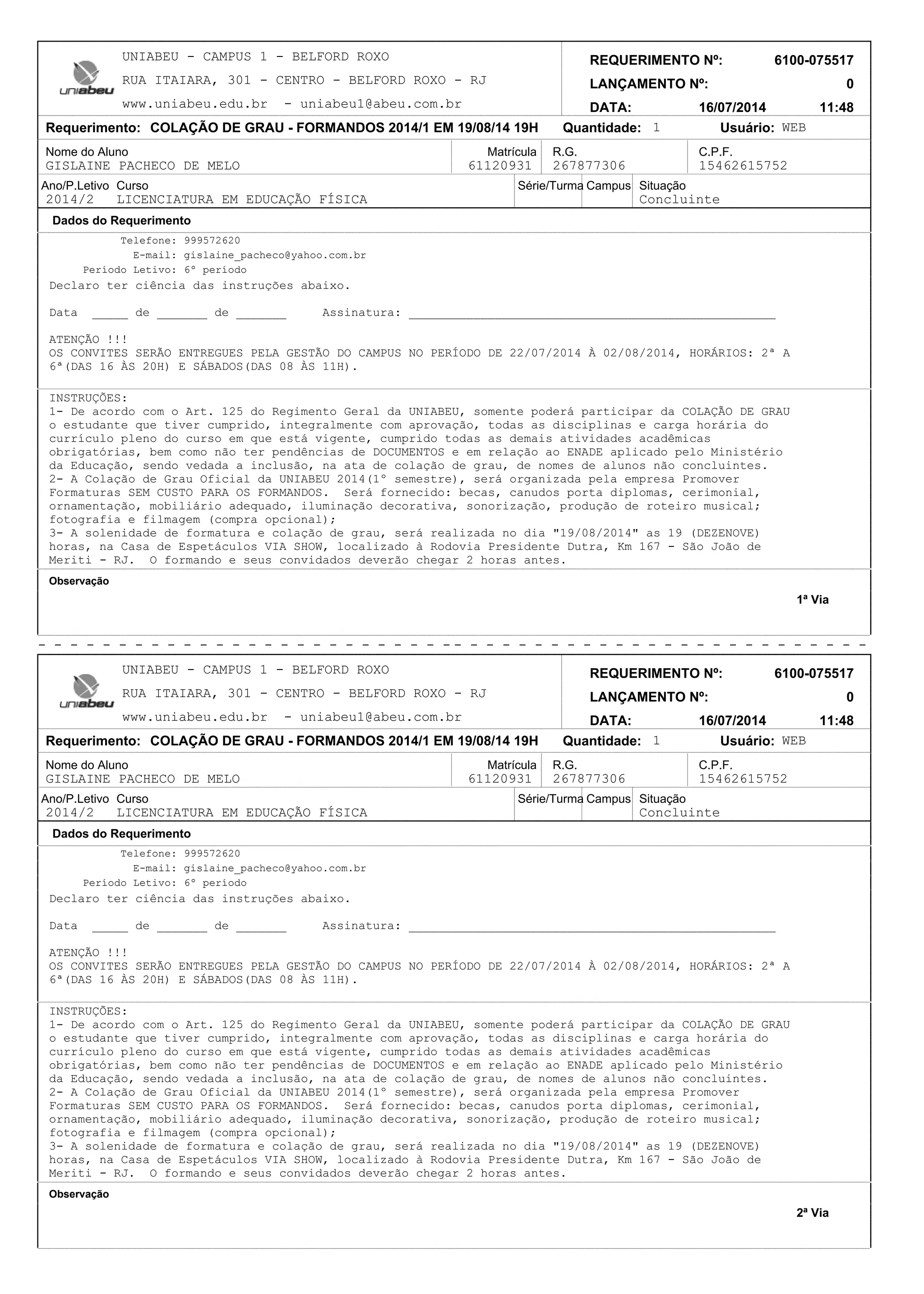 O documento é um requerimento para a colação de grau da aluna Gislaine Pacheco de Melo no curso de Licenciatura em Educação Física pela UNIABEU em 19 de agosto de 2014. Ele fornece instruções sobre os requisitos para participação na cerimônia, a organização da formatura pela empresa Promover Formaturas sem custo para os formandos e o local e horário do evento.
