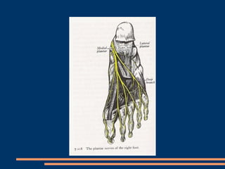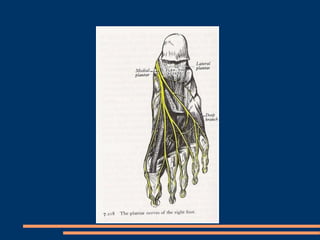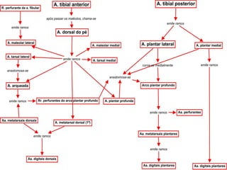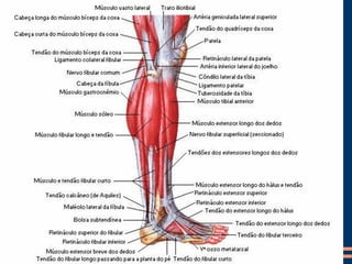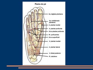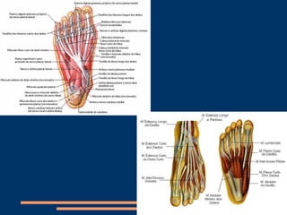 O documento descreve a anatomia do pé, incluindo os ossos (tarso, metatarso e falanges), articulações (talocrural, tarso-metatarsais e metatarsofalângicas), ligamentos, vasos sanguíneos e inervação. Detalha os músculos do pé divididos em compartimentos anterior, posterior, profundo e lateral, assim como os músculos intrínsecos em 4 camadas.