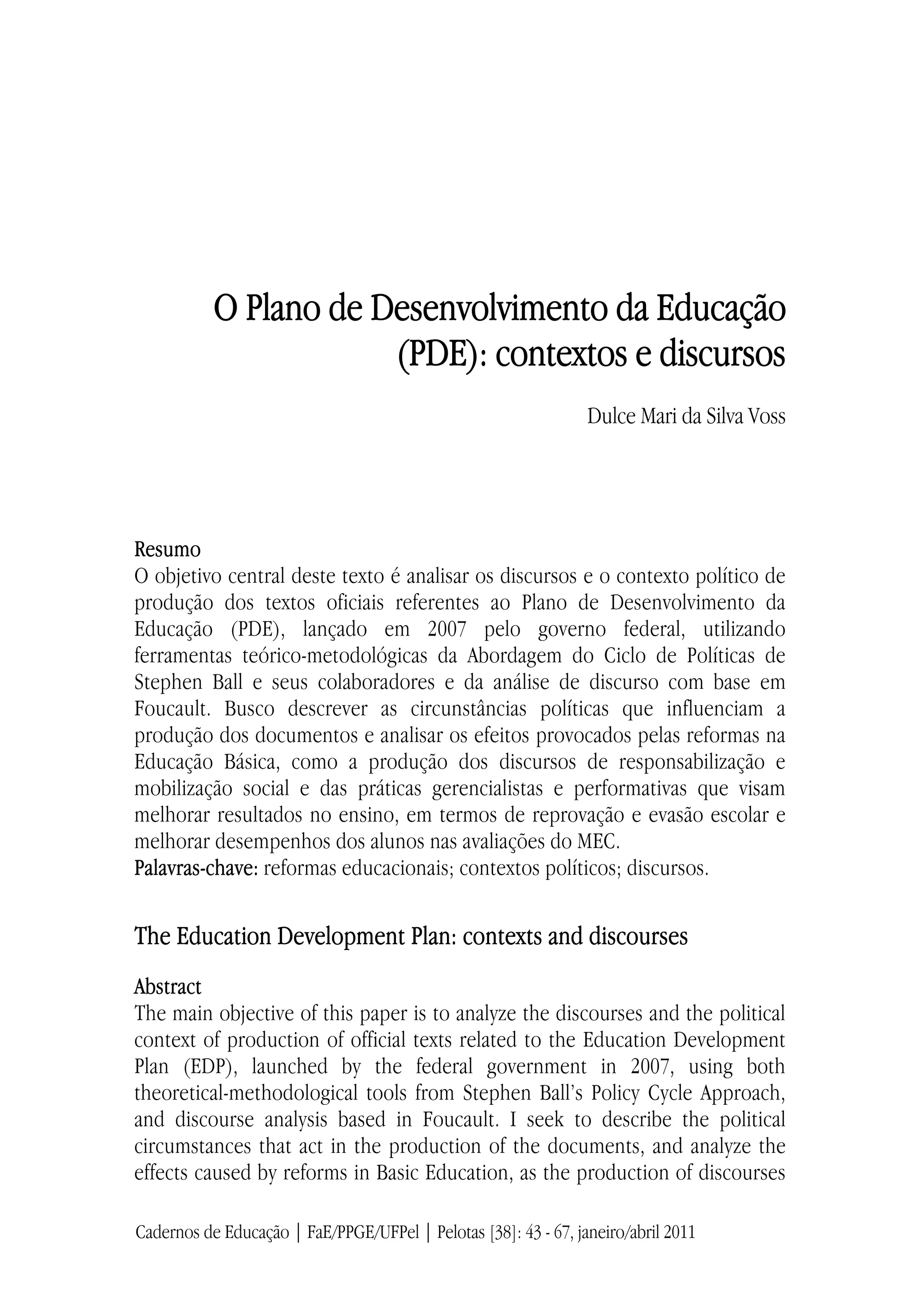 O documento analisa o contexto político e os discursos do Plano de Desenvolvimento da Educação (PDE) lançado pelo governo federal brasileiro em 2007. O PDE instituiu várias reformas educacionais sem amplo debate, gerando críticas. O documento também discute como o PDE enfatizou o Índice de Desenvolvimento da Educação Básica (IDEB) para medir qualidade da educação e justificar novas políticas como o Compromisso Todos pela Educação.