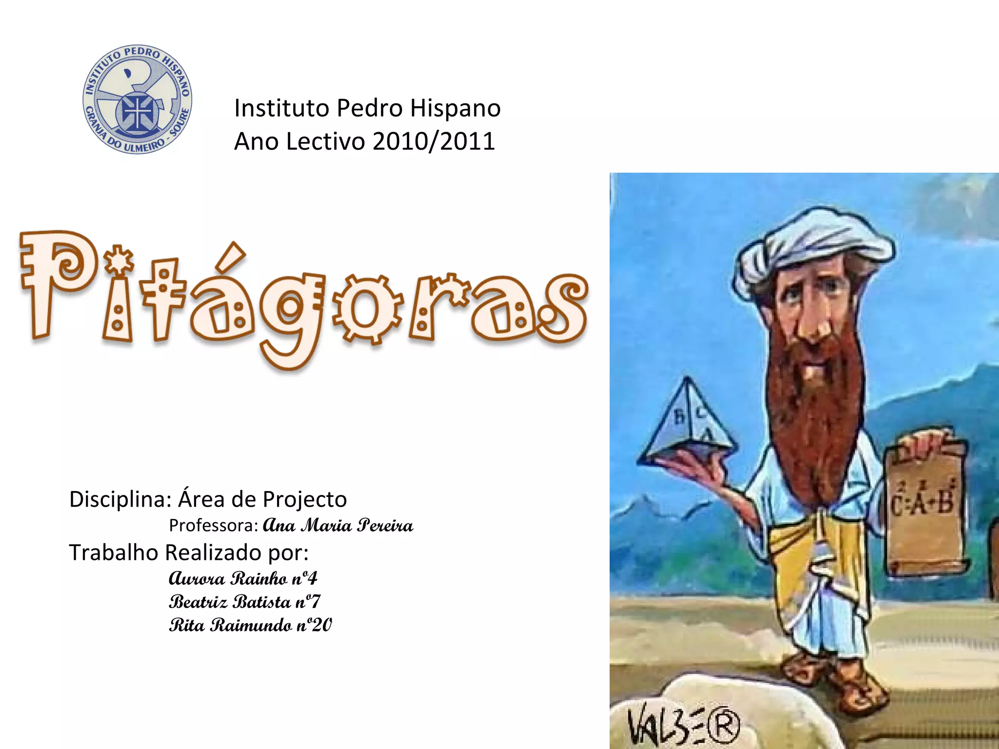 Este documento resume a vida e contribuições de Pitágoras para a matemática. Pitágoras era um matemático e filósofo grego do século VI a.C. que fundou a Escola Pitagórica e descobriu o Teorema de Pitágoras sobre triângulos retângulos. Ele também estudou números, figuras geométricas e música.