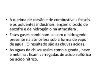 A queima de combustíveis fósseis lança gases na atmosfera que formam chuvas ácidas, alterando o solo, as águas e causando danos a estruturas e vegetação. O dióxido de carbono liberado pela respiração e combustão também aumenta na atmosfera devido ao maior consumo de combustíveis.