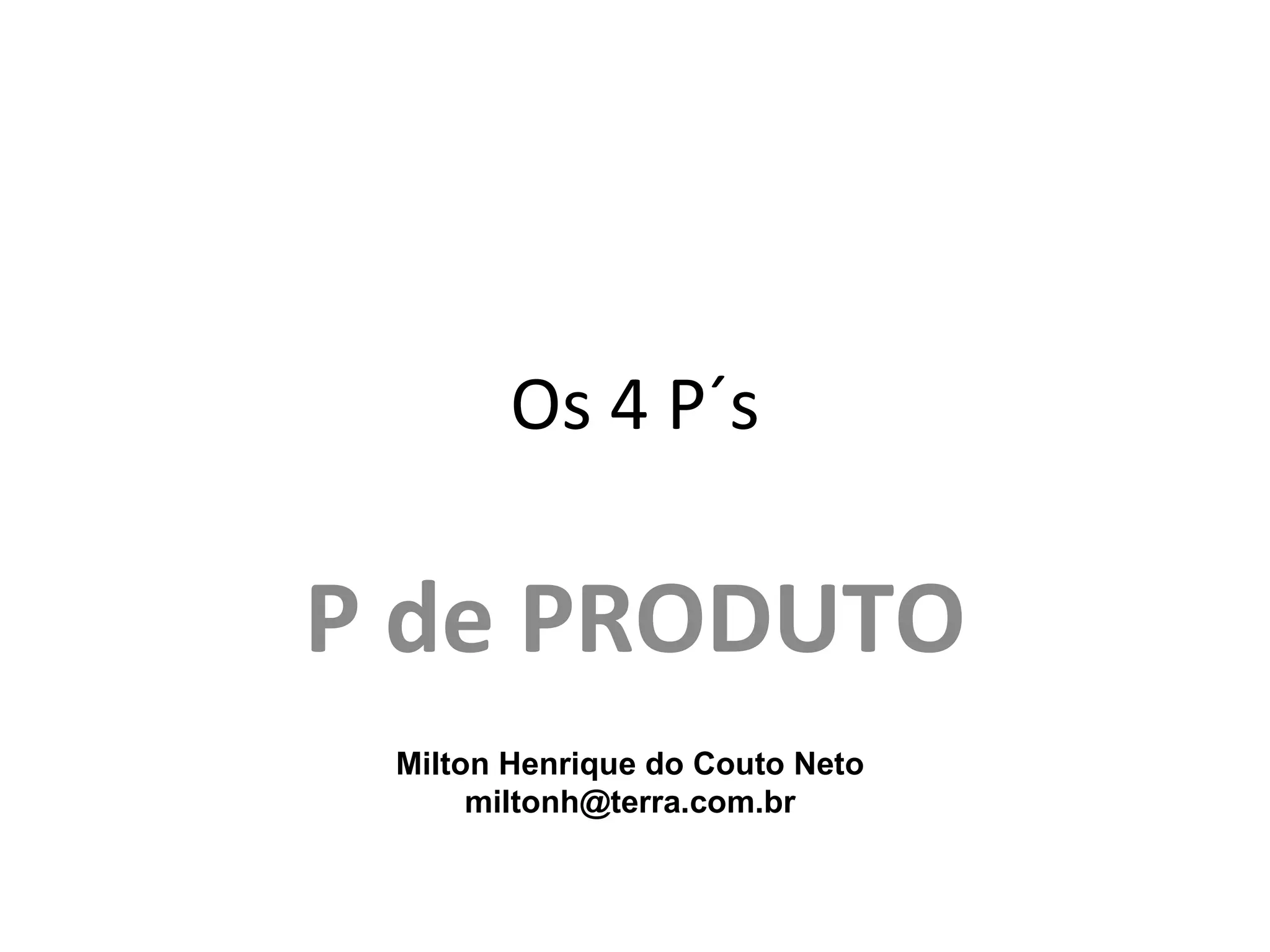 O documento discute os 4 P's do marketing, focando no P de Produto. Explica o que é um produto e classifica-os em produtos físicos, serviços, pessoas, locais e organizações. Também discute o ciclo de vida dos produtos, estratégias para introdução no mercado, classificação de produtos e decisões sobre portfólio e atributos dos produtos.