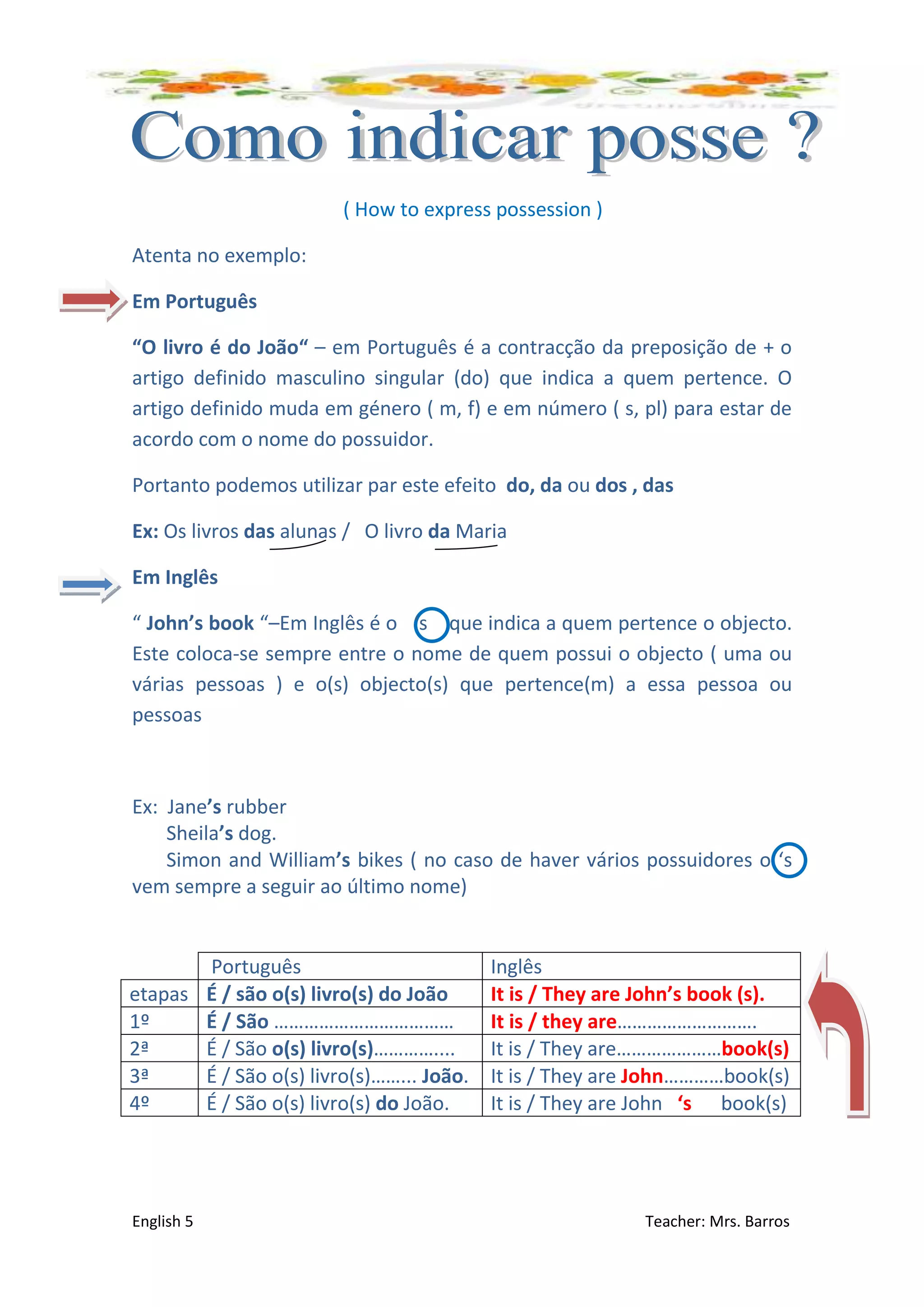 O documento explica como expressar posse em português e inglês. Em português, usa-se a contração "do/da/dos/das" antes do nome do possuidor. Em inglês, usa-se o apóstrofo "s" após o nome do possuidor. Fornece exemplos como "O livro do João" e "John's book".
