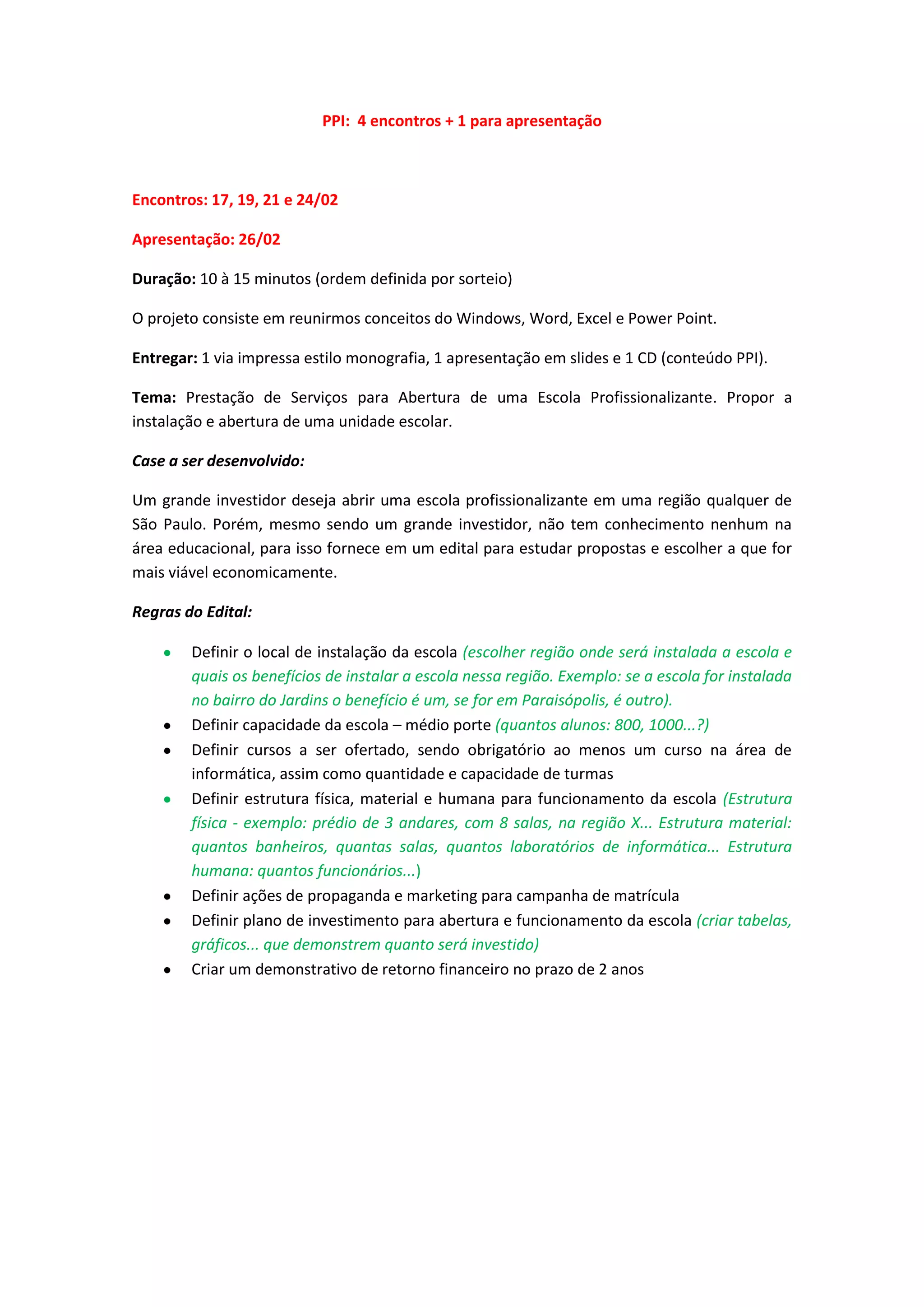 O documento fornece instruções para um projeto de Prestação de Serviços para a Abertura de uma Escola Profissionalizante. Os alunos devem se reunir em 4 encontros e apresentar seu projeto em 26 de fevereiro. O projeto deve propor a instalação e abertura de uma escola profissionalizante considerando as regras de um edital fornecido, como definir a localização, capacidade, cursos, estrutura física, humana e material, plano de marketing e investimento.