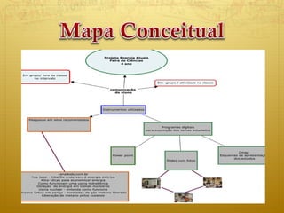 Os professores propõem um projeto para a Feira de Ciências sobre energia que envolva os alunos em coletar dados e apresentar os conhecimentos adquiridos usando ferramentas digitais. Os alunos usarão o Movie Maker para explicar como funcionam usinas de energia através de uma maquete e cenas filmadas. Eles também usarão o Cmap Tools para criar mapas conceituais sobre os assuntos abordados.