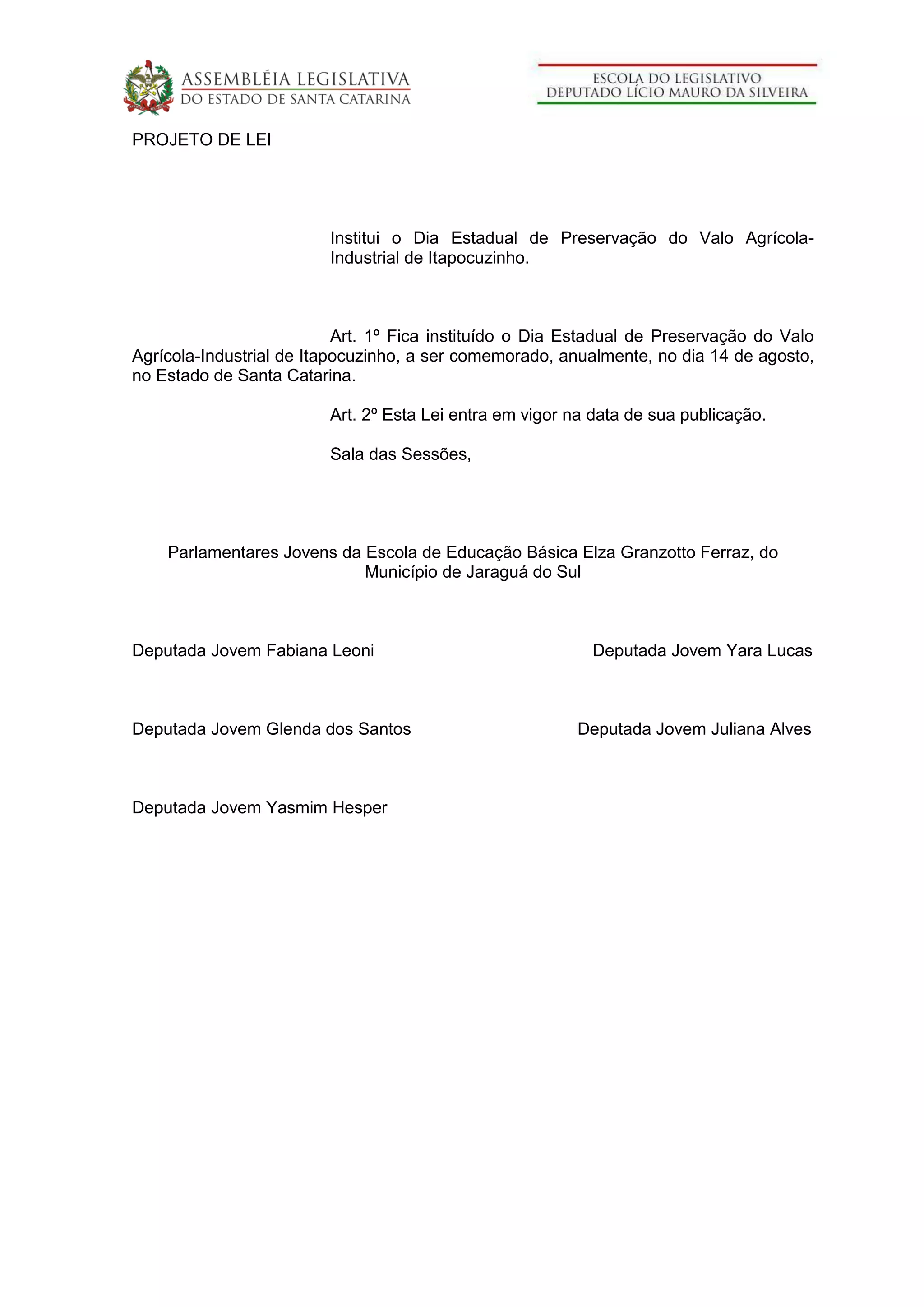 O documento propõe a instituição do Dia Estadual de Preservação do Valo Agrícola-Industrial de Itapocuzinho no estado de Santa Catarina, a ser comemorado anualmente em 14 de agosto, para conscientizar a população sobre a importância de preservar este recurso hídrico histórico para a agricultura local.