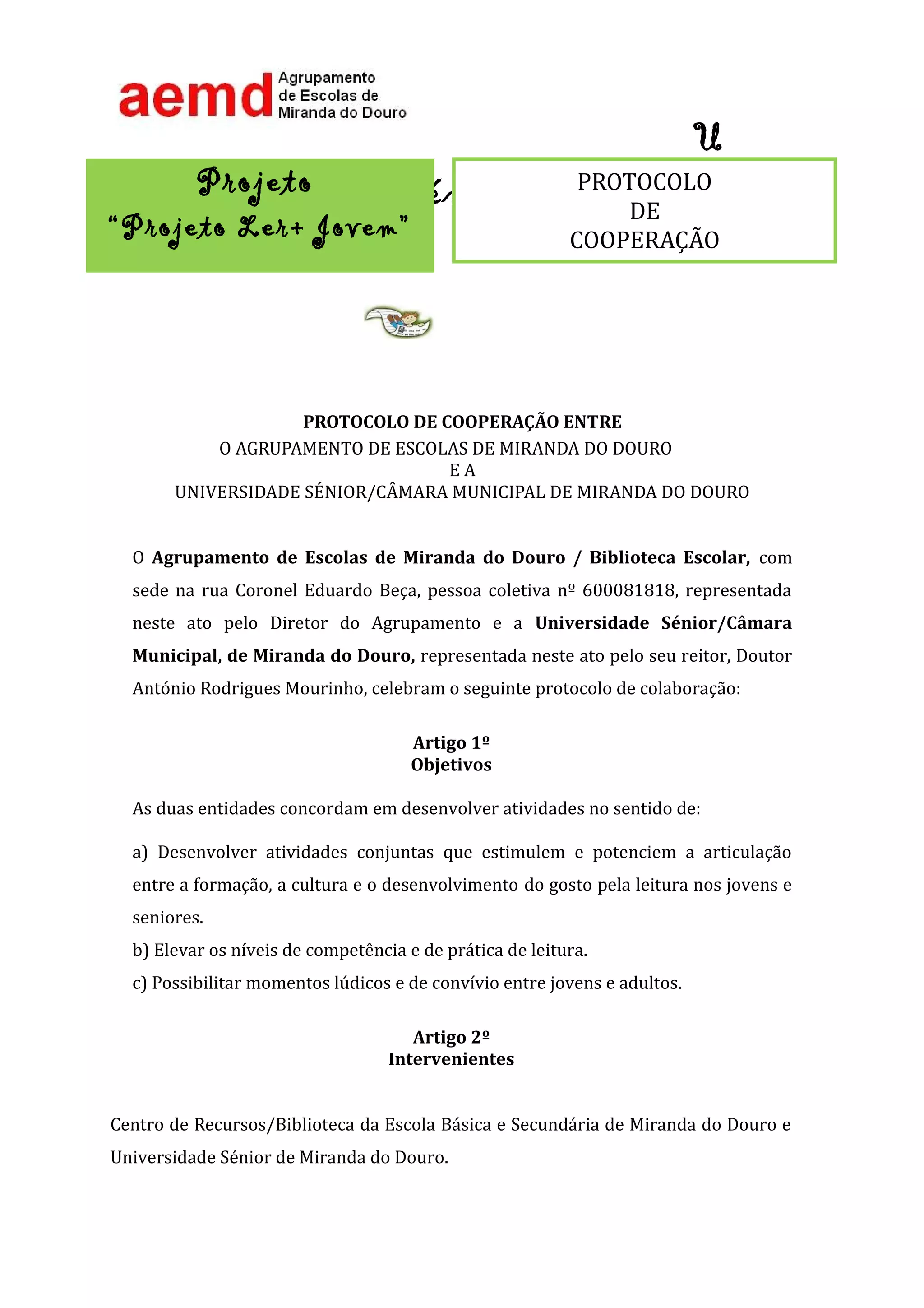 Este protocolo estabelece uma cooperação entre uma escola e uma universidade sénior para promover atividades conjuntas que estimulem a leitura entre jovens e idosos. As duas entidades irão desenvolver um projeto chamado "Projeto Ler+ Jovem" no qual alunos e idosos irão participar em rodas de conversa sobre livros lidos e trocar opiniões sobre leitura. O projeto irá decorrer durante o ano letivo de 2012-2013.