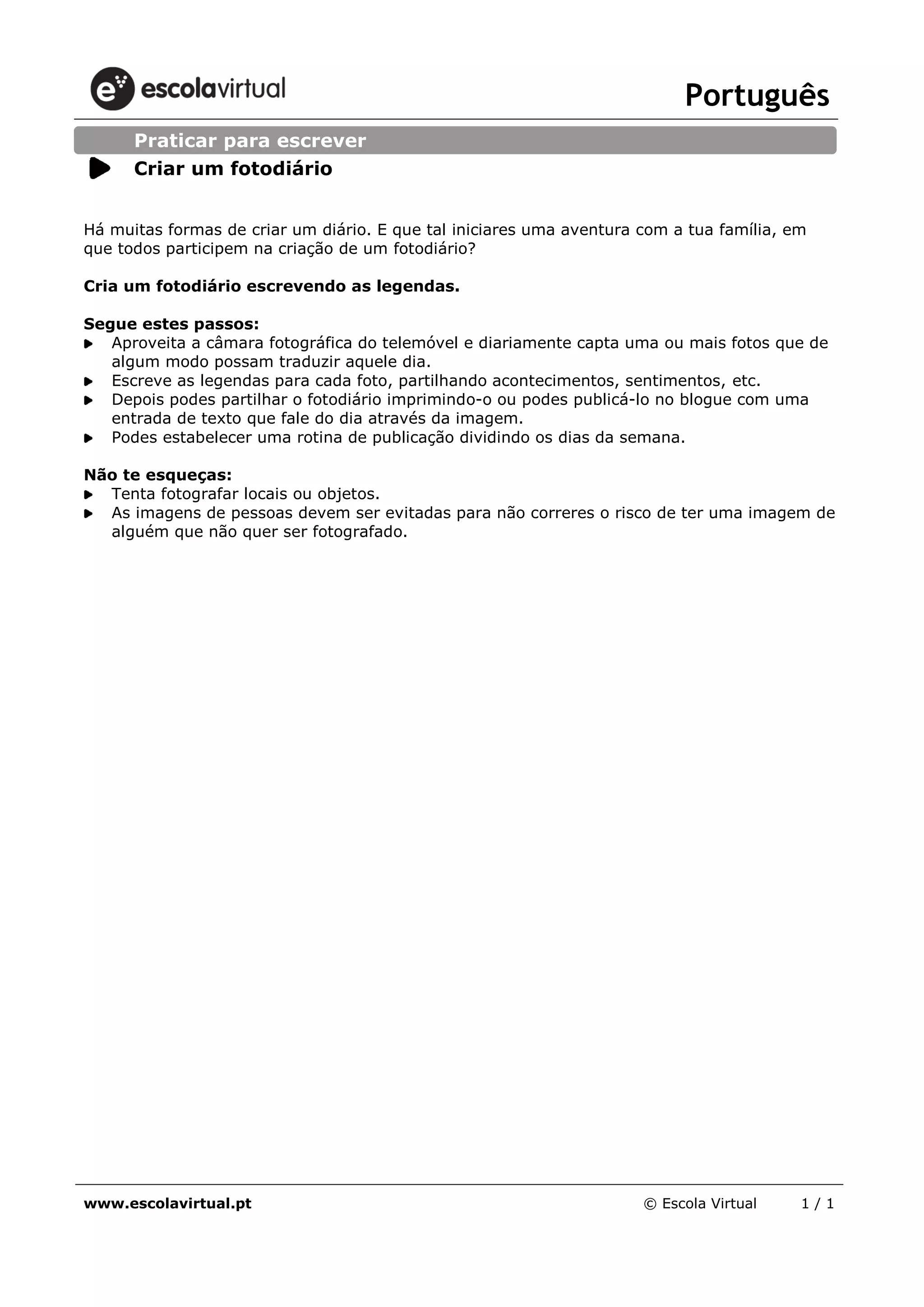 Este documento fornece instruções para criar um fotodiário familiar, captando fotos diárias com legendas que descrevem os acontecimentos e sentimentos do dia, e depois compartilhando o fotodiário impresso ou online.