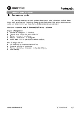 O texto fornece instruções para escrever um conto baseado em uma história conhecida sobre fadas, gnomos ou duendes. Ele instrui o leitor a considerar as categorias da narrativa, escrever o conto em um editor de texto, contar o número de caracteres, adequar a pontuação e parágrafos, e revisar o rascunho final.