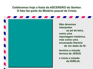 O documento descreve a festa da Ascensão de Jesus e sua importância para a Igreja. Resume que a Ascensão marca o fim da missão terrena de Jesus e o início da missão da Igreja, animada pelo Espírito Santo. Também destaca que a Ascensão não é uma despedida, mas uma nova presença de Cristo através dos sinais da missão evangelizadora da Igreja.