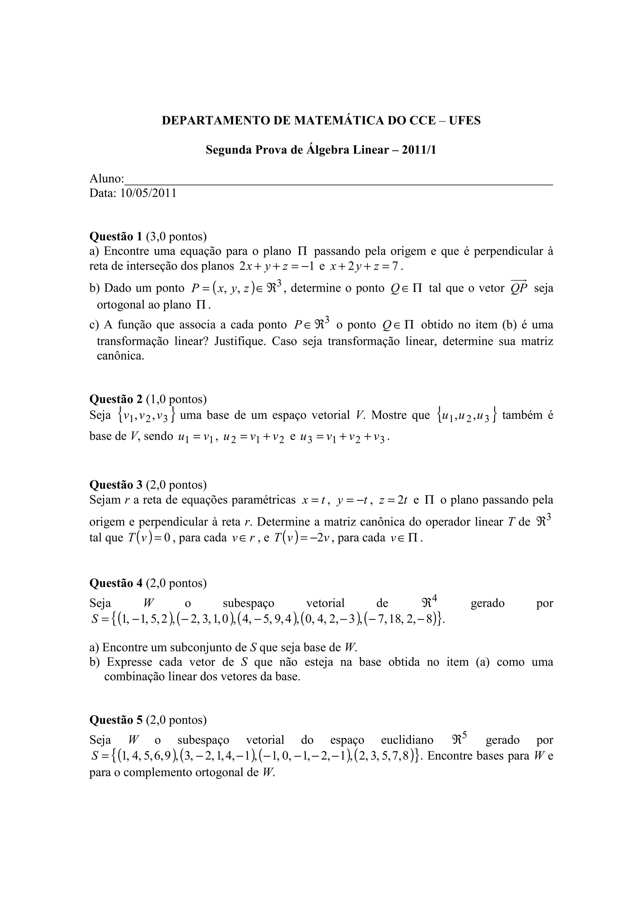 (1) A prova de Álgebra Linear contém 5 questões sobre planos, transformações lineares, subespaços vetoriais e bases.