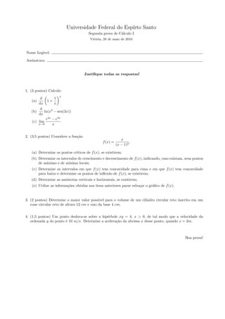 1) Cálculos de derivadas de funções: (a) 1/(1+x)^2, (b) d/dx ln(x^3 - sen(3x)), (c) limite de e^2x - e^3x quando x tende a 0.