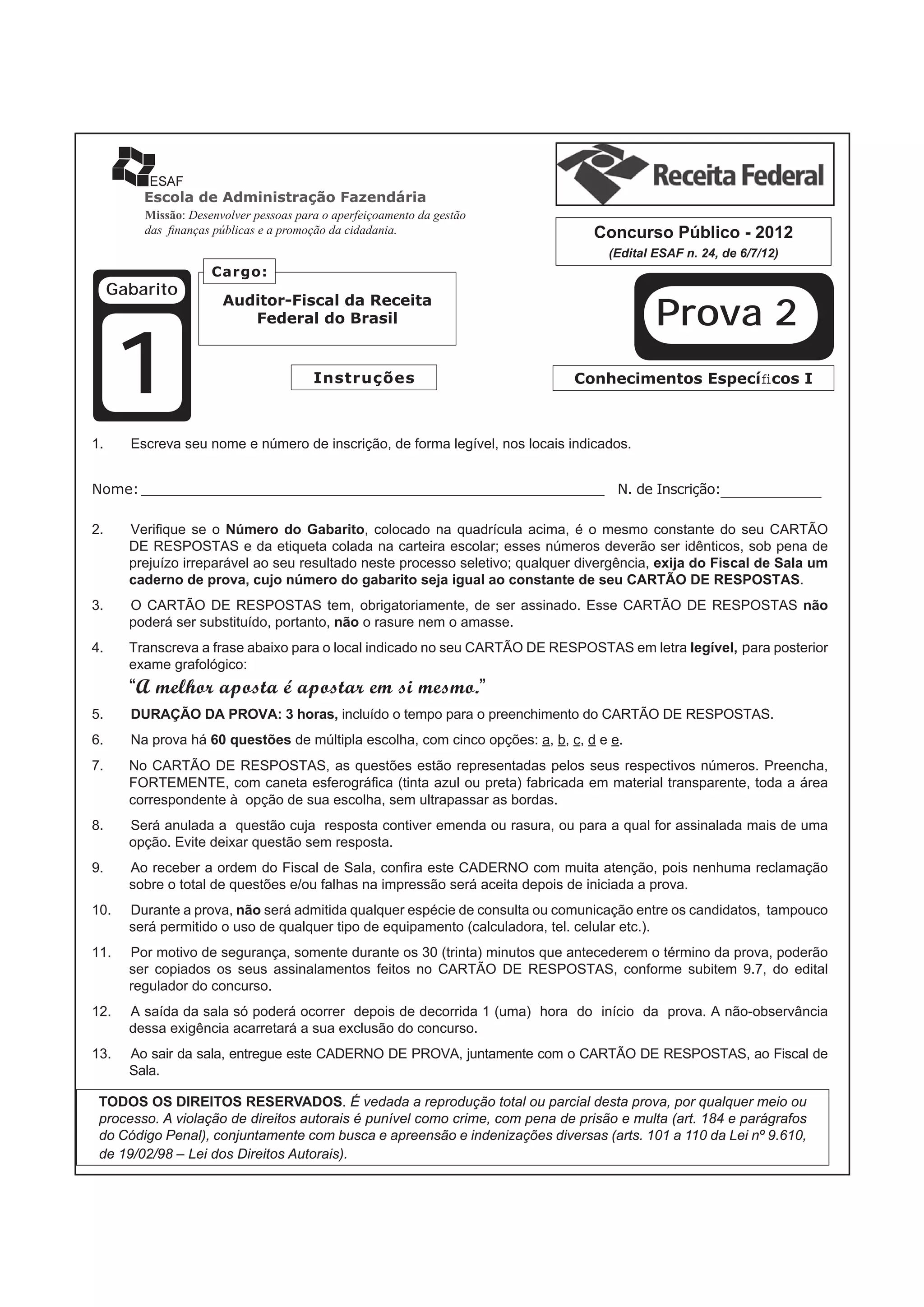 O documento trata de um edital de concurso público para o cargo de Auditor-Fiscal da Receita Federal do Brasil realizado pela Escola de Administração Fazendária em 2012. O edital contém instruções sobre a realização da prova, questões de conhecimentos específicos e gabarito.