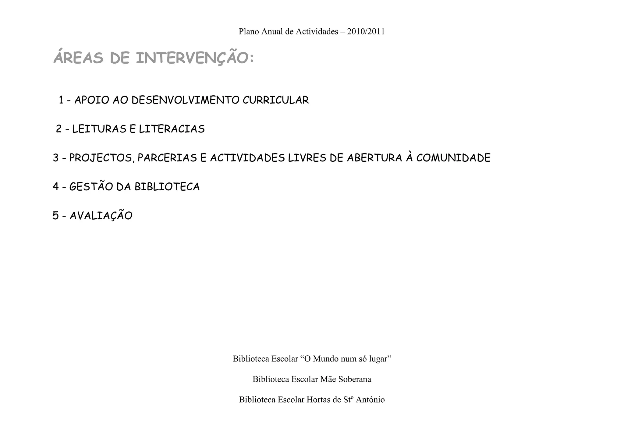 Este documento apresenta o plano anual de atividades para 2010/2011 das bibliotecas escolares do Agrupamento. O plano inclui cinco áreas de intervenção: 1) apoio ao desenvolvimento curricular, 2) leituras e literacias, 3) projetos, parcerias e atividades livres de abertura à comunidade, 4) gestão da biblioteca, e 5) avaliação. O plano descreve várias atividades e objetivos para cada área ao longo do ano letivo visando apoiar os alunos e professores e promover o uso da