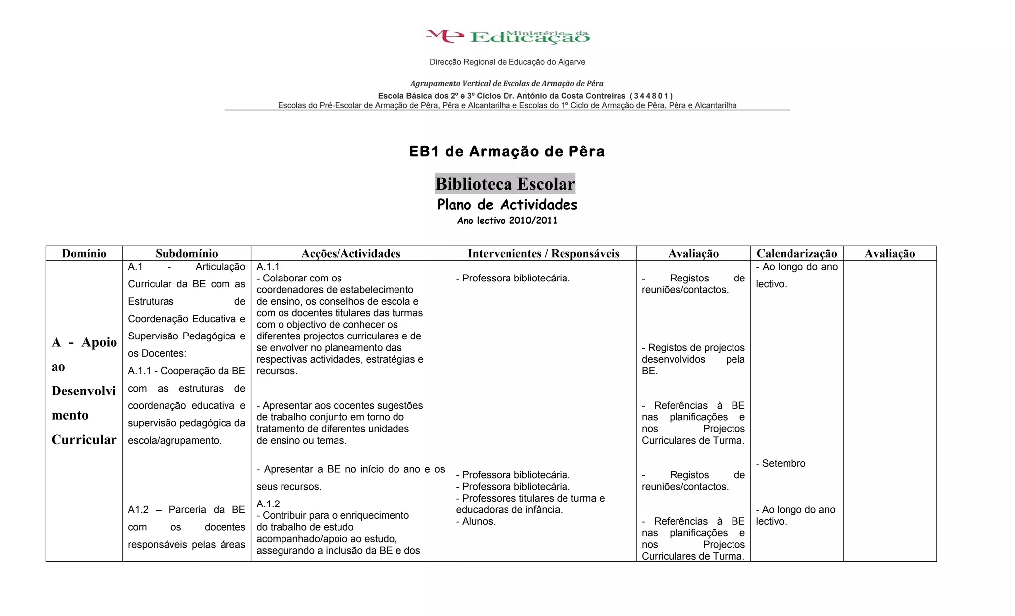 Este documento apresenta o plano de atividades da biblioteca escolar EB1 de Armação de Pêra para o ano letivo de 2010/2011. O plano inclui apoio ao desenvolvimento curricular através da articulação com professores e projetos educativos, promoção da leitura e literacia, e projetos e atividades culturais abertas à comunidade escolar.