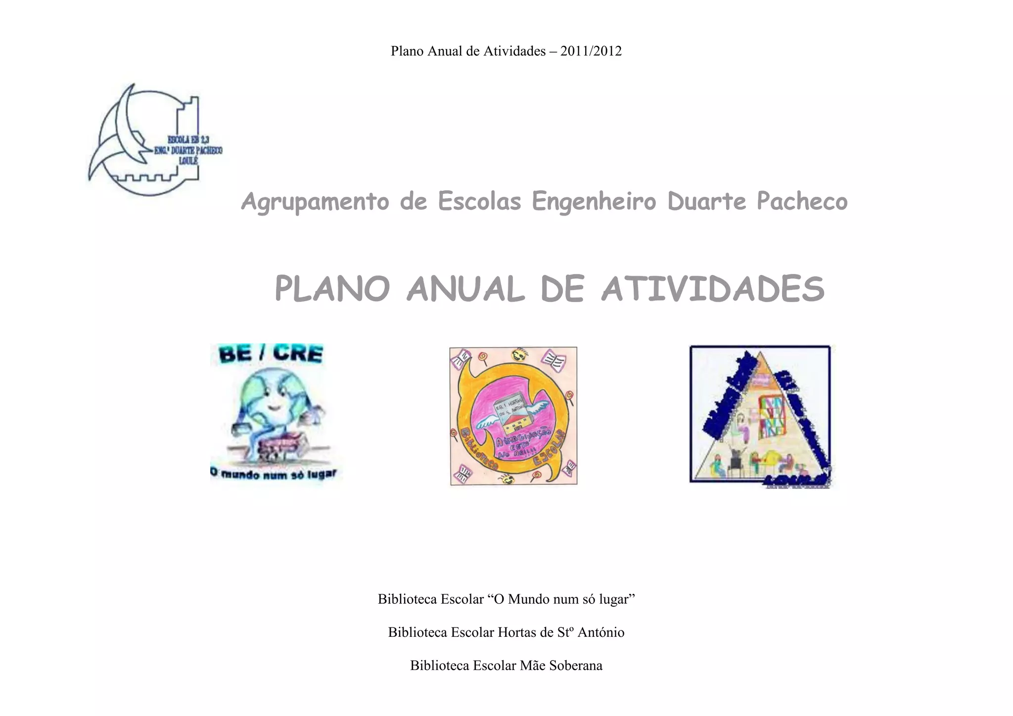 Este plano anual de atividades para as bibliotecas escolares descreve as áreas de intervenção, atividades, objetivos e recursos para o ano letivo de 2011/2012. As áreas de intervenção incluem apoio ao desenvolvimento curricular, leituras e literacias, projetos com a comunidade, gestão da biblioteca e avaliação. Uma variedade de atividades são planejadas para promover a leitura e as competências de informação entre os alunos.
