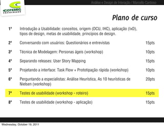 O documento aborda a análise e design de interação, focando em usabilidade e testes com usuários. Ele detalha as etapas e métodos para aplicar testes de usabilidade, incluindo planejamento, tipos de teste e considerações práticas em ambientes de campo e laboratório. O objetivo principal é validar soluções de interface e melhorar a experiência do usuário por meio de feedback direto.