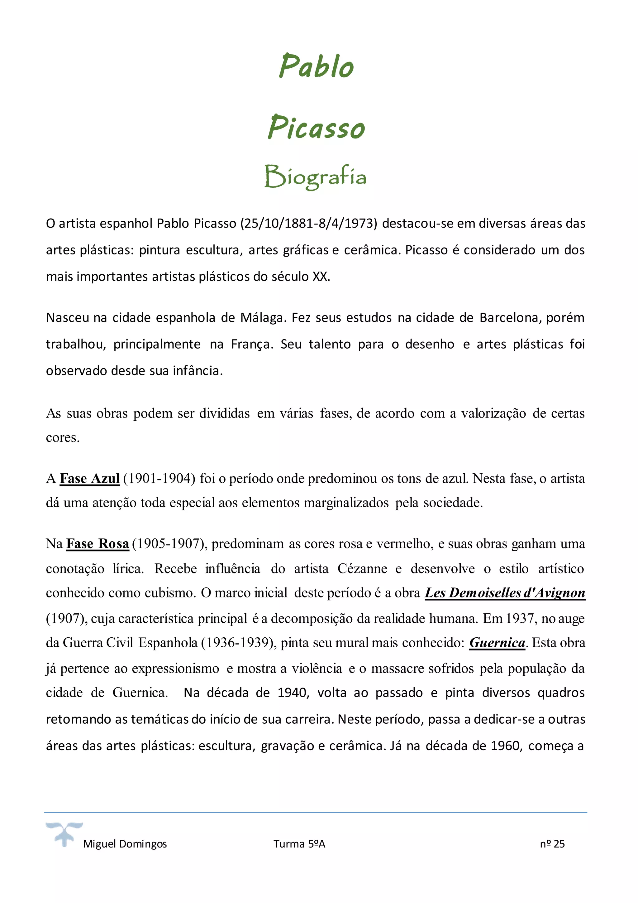 Pablo Picasso foi um importante artista espanhol do século XX que se destacou na pintura, escultura, artes gráficas e cerâmica. Sua carreira artística foi dividida em várias fases definidas por cores predominantes, como a Fase Azul e a Fase Rosa. Suas obras mais famosas incluem Les Demoiselles d'Avignon e Guernica.