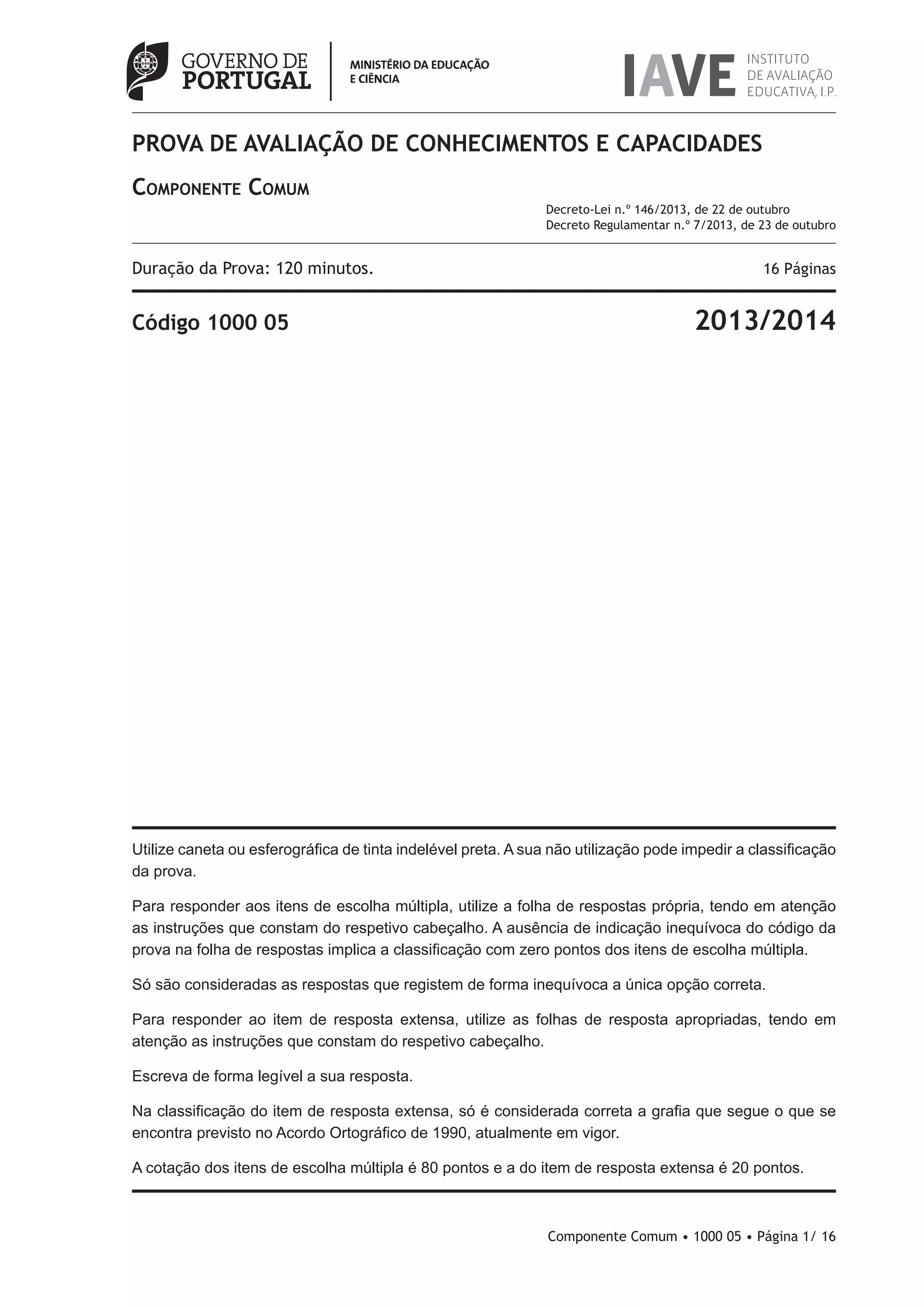 (1) O documento apresenta uma prova de avaliação de conhecimentos e capacidades composta por 16 páginas e 120 minutos de duração. (2) A prova inclui itens de escolha múltipla e um item de resposta extensa sobre um texto literário. (3) São fornecidas instruções sobre como responder aos diferentes tipos de itens.